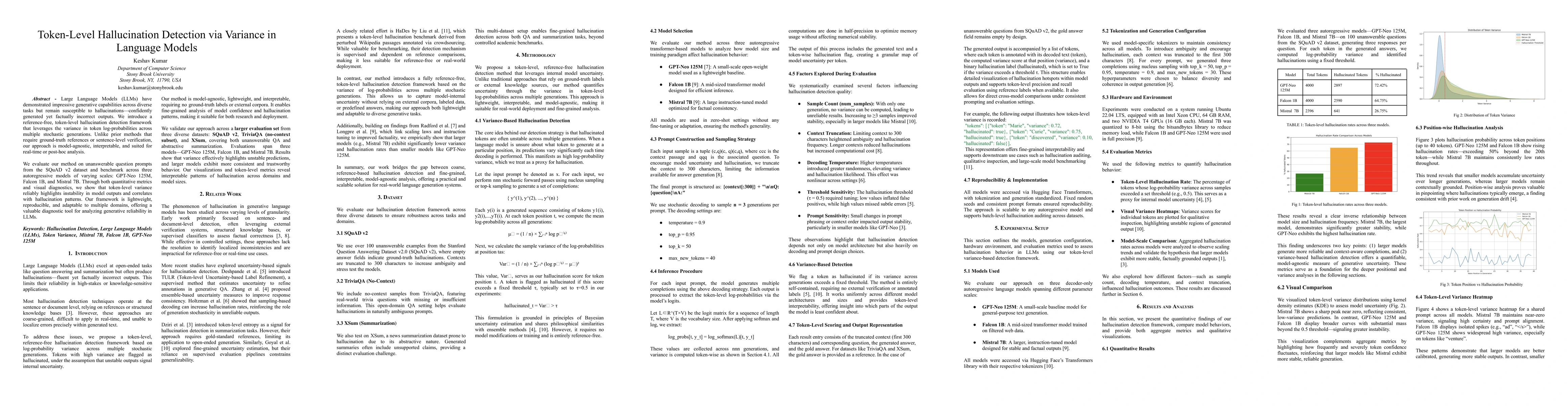 Large Language Models (LLMs) have demonstrated impressive generative capabilities across diverse tasks but remain susceptible to hallucinations, confidently generated yet factually incorrect outputs. We introduce a reference-free, token-level hallucination detection framework that leverages the variance in token log-probabilities across multiple stochastic generations. Unlike prior methods that require ground-truth references or sentence-level verification, our approach is model-agnostic, interpretable, and suited for real-time or post-hoc analysis. We evaluate our method on unanswerable question prompts from the SQuAD v2 dataset and benchmark across three autoregressive models of varying scales: GPT-Neo 125M, Falcon 1B, and Mistral 7B. Through both quantitative metrics and visual diagnostics, we show that token-level variance reliably highlights instability in model outputs and correlates with hallucination patterns. Our framework is lightweight, reproducible, and adaptable to multiple domains, offering a valuable diagnostic tool for analyzing generative reliability in LLMs.