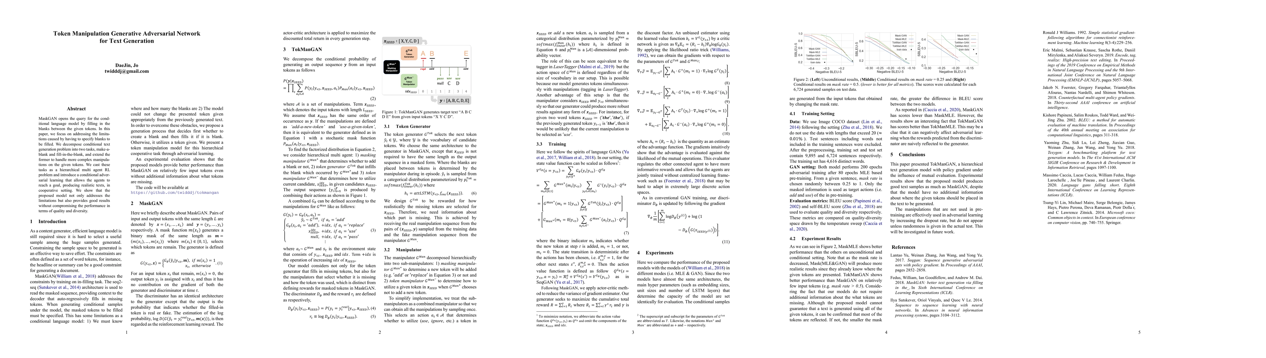 The paper introduces TokManGAN, a hierarchical text generation model utilizing policy gradient under mutual evaluation. It decomposes conditional text generation into make-a-blank and fill-in-the-blank tasks, casting them as a hierarchical multi-agent reinforcement learning problem with conditional adversarial learning.