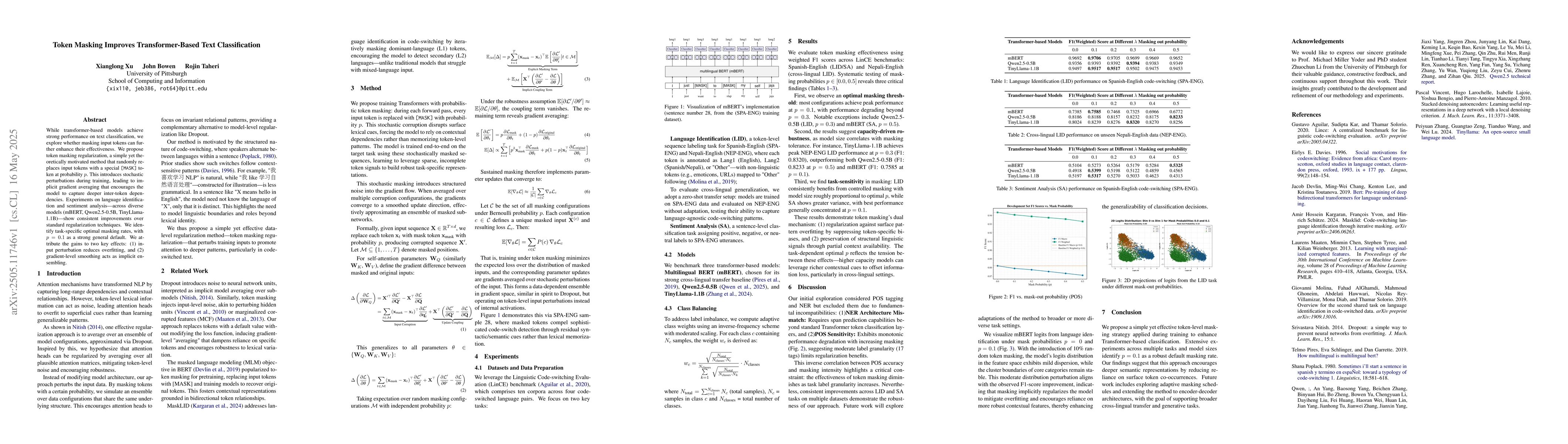 While transformer-based models achieve strong performance on text classification, we explore whether masking input tokens can further enhance their effectiveness. We propose token masking regularization, a simple yet theoretically motivated method that randomly replaces input tokens with a special [MASK] token at probability p. This introduces stochastic perturbations during training, leading to implicit gradient averaging that encourages the model to capture deeper inter-token dependencies. Experiments on language identification and sentiment analysis -- across diverse models (mBERT, Qwen2.5-0.5B, TinyLlama-1.1B) -- show consistent improvements over standard regularization techniques. We identify task-specific optimal masking rates, with p = 0.1 as a strong general default. We attribute the gains to two key effects: (1) input perturbation reduces overfitting, and (2) gradient-level smoothing acts as implicit ensembling.