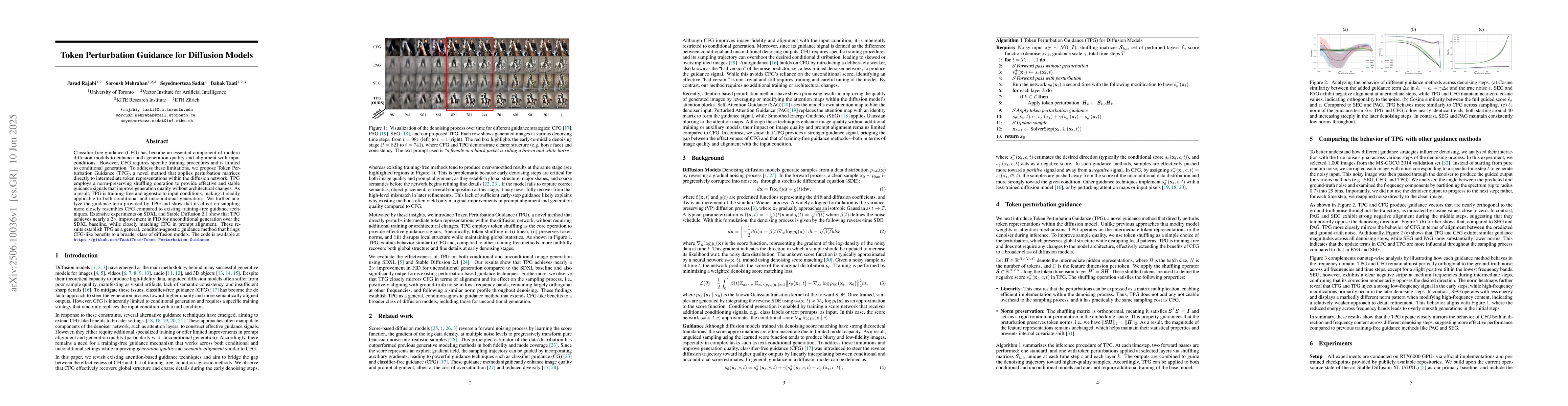 Token Perturbation Guidance (TPG) improves diffusion model generation quality without training, offering near 2x FID gains for unconditional generation and matching CFG's prompt alignment.