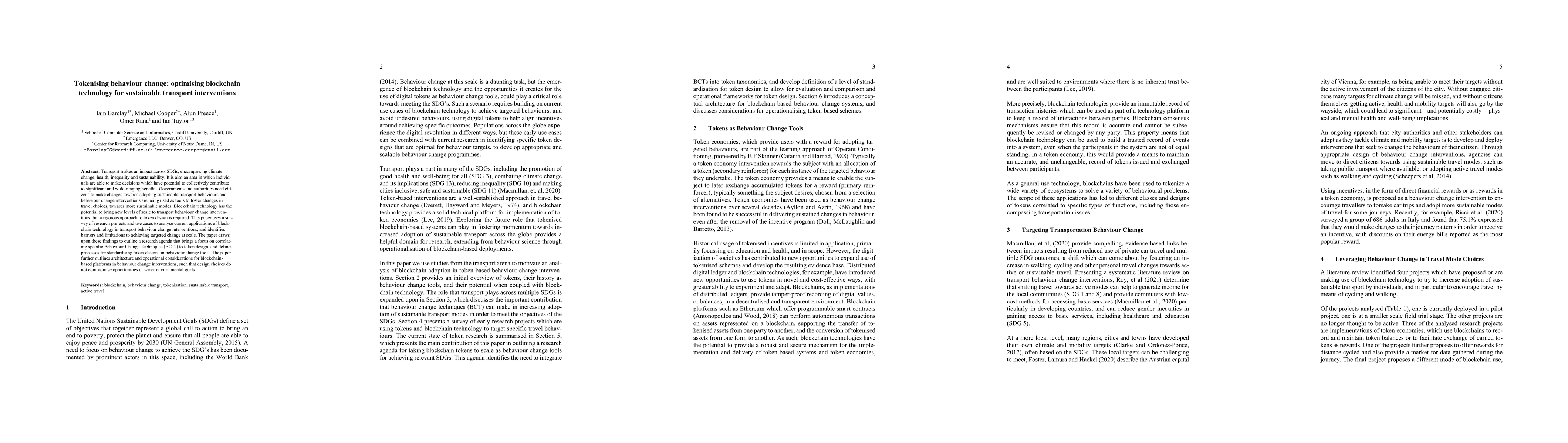 This paper explores how blockchain technology can facilitate sustainable transport interventions through tokenising behaviour change, highlighting key findings on barriers and limitations to achieving targeted change at scale.