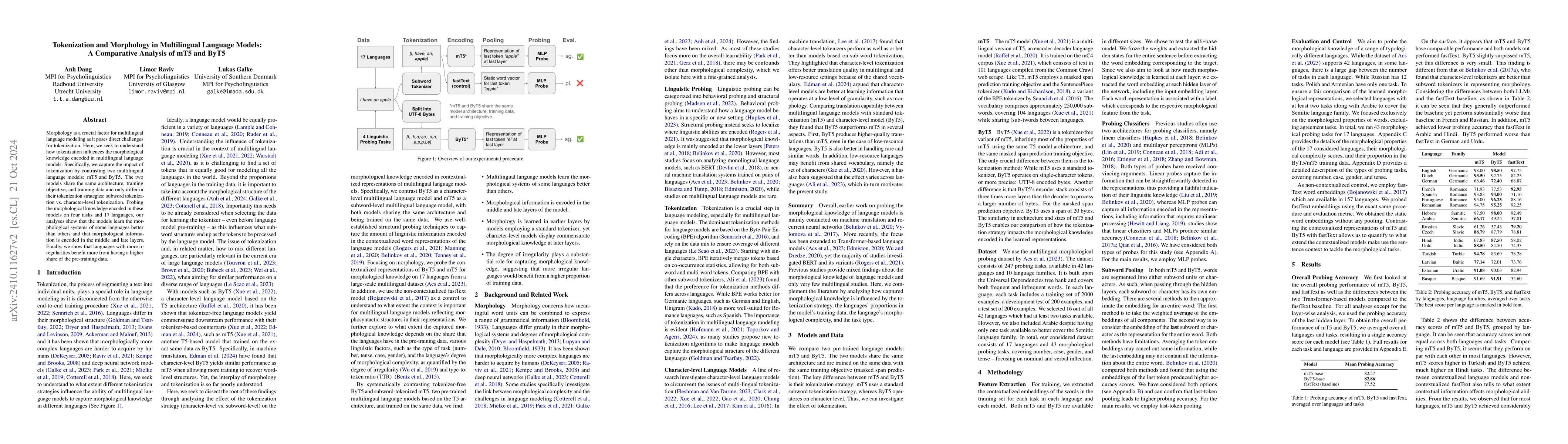 This paper compares the morphological encoding in two multilingual language models, mT5 and ByT5, which differ only in their tokenization strategies (subword vs. character-level). Findings indicate that morphological knowledge varies across languages and is primarily encoded in the middle and late layers, with character-based models requiring more layers for equivalent performance accuracy.