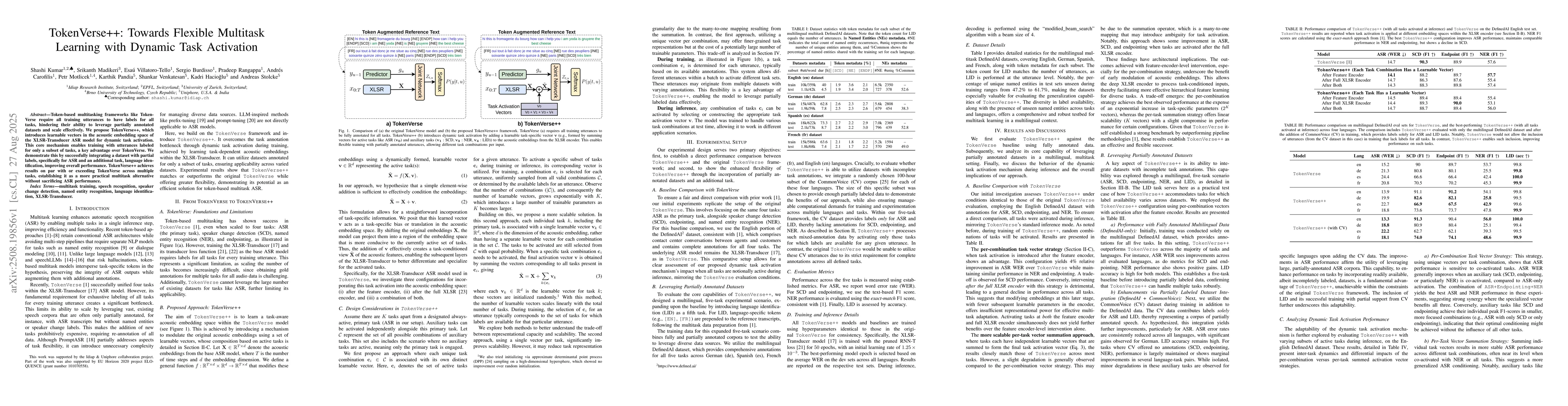 Token-based multitasking frameworks like TokenVerse require all training utterances to have labels for all tasks, hindering their ability to leverage partially annotated datasets and scale effectively. We propose TokenVerse++, which introduces learnable vectors in the acoustic embedding space of the XLSR-Transducer ASR model for dynamic task activation. This core mechanism enables training with utterances labeled for only a subset of tasks, a key advantage over TokenVerse. We demonstrate this by successfully integrating a dataset with partial labels, specifically for ASR and an additional task, language identification, improving overall performance. TokenVerse++ achieves results on par with or exceeding TokenVerse across multiple tasks, establishing it as a more practical multitask alternative without sacrificing ASR performance.