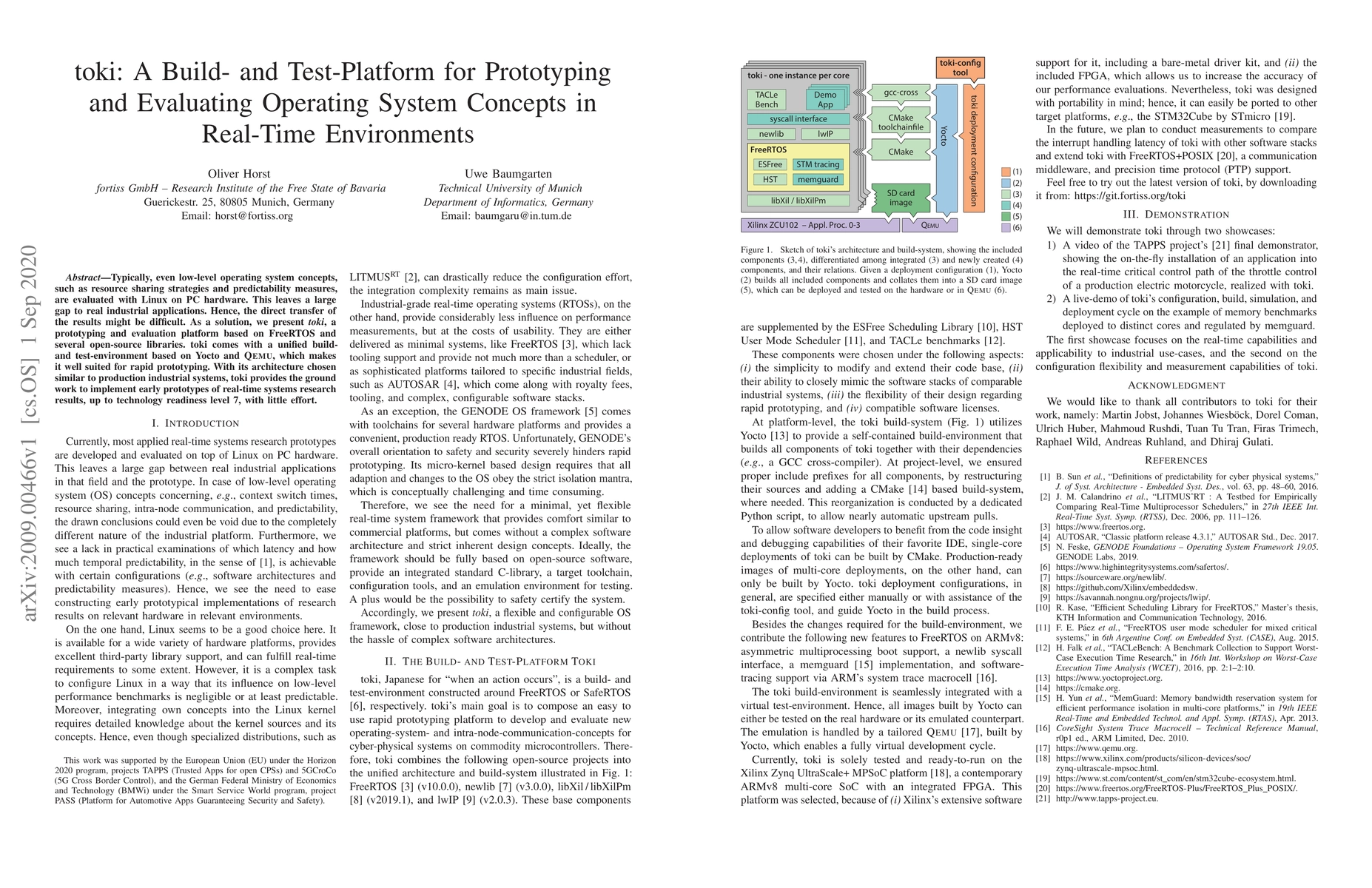 The paper introduces toki, a prototyping and evaluation platform based on FreeRTOS and open-source libraries, designed for rapid prototyping of real-time operating system concepts in environments similar to industrial applications. It utilizes Yocto and Qemu for a unified build-and-test environment, facilitating the early implementation of real-time system research results.