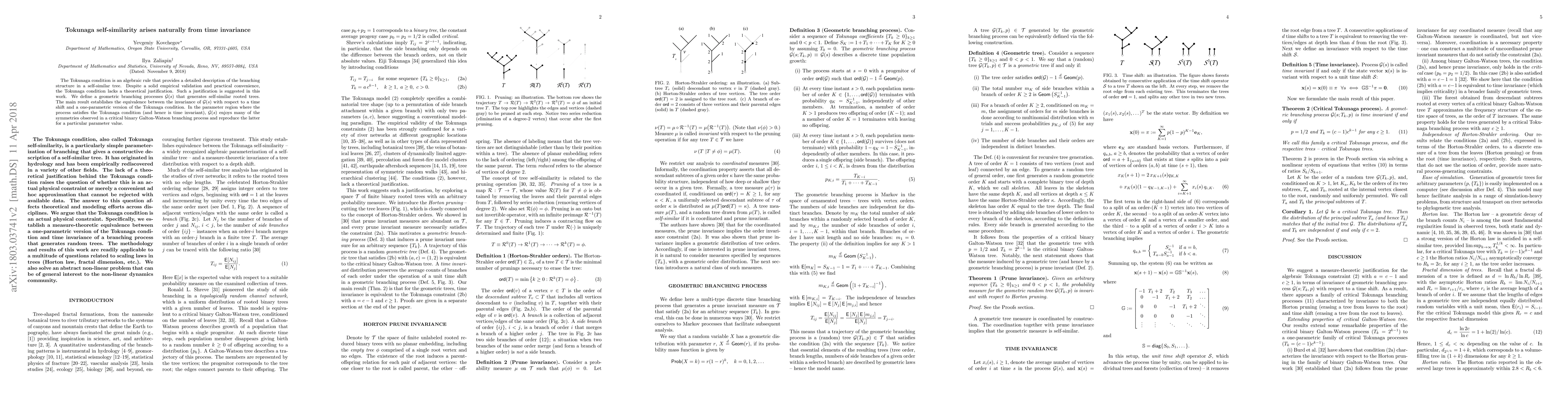 This paper provides a theoretical justification for the Tokunaga condition, which describes the branching structure in self-similar trees, by showing its equivalence with time invariance in a defined geometric branching process. The process $\mathcal{G}(s)$ reproduces symmetries of a critical binary Galton-Watson branching process under the Tokunaga condition.