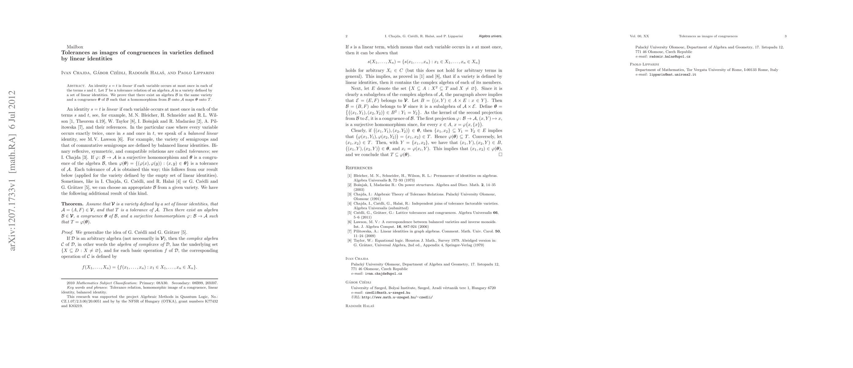 An identity s=t is linear if each variable occurs at most once in each of the terms s and t. Let T be a tolerance relation of an algebra A in a variety defined by a set of linear identities. We prove that there exist an algebra B in the same variety and a congruence Theta of B such that a homomorphism from B onto A maps Theta onto T.
