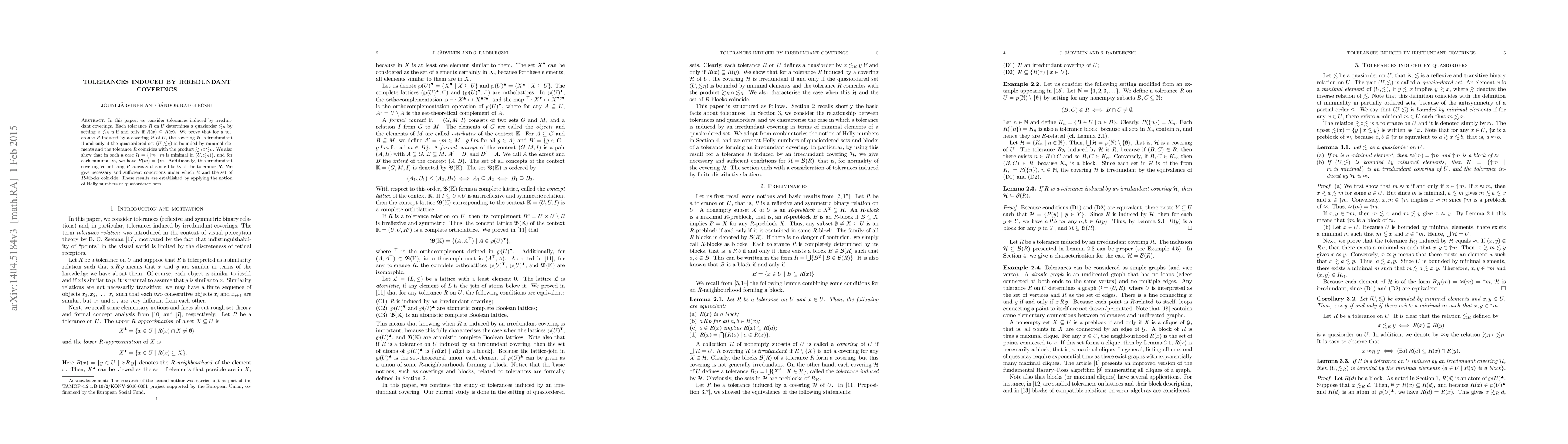 This paper investigates tolerances induced by irredundant coverings, proving that such coverings correspond to quasiordered sets bounded by minimal elements and where the tolerance coincides with the product relation. It also establishes conditions for the equivalence between irredundant coverings and the blocks of the tolerance, using Helly numbers of quasiordered sets.