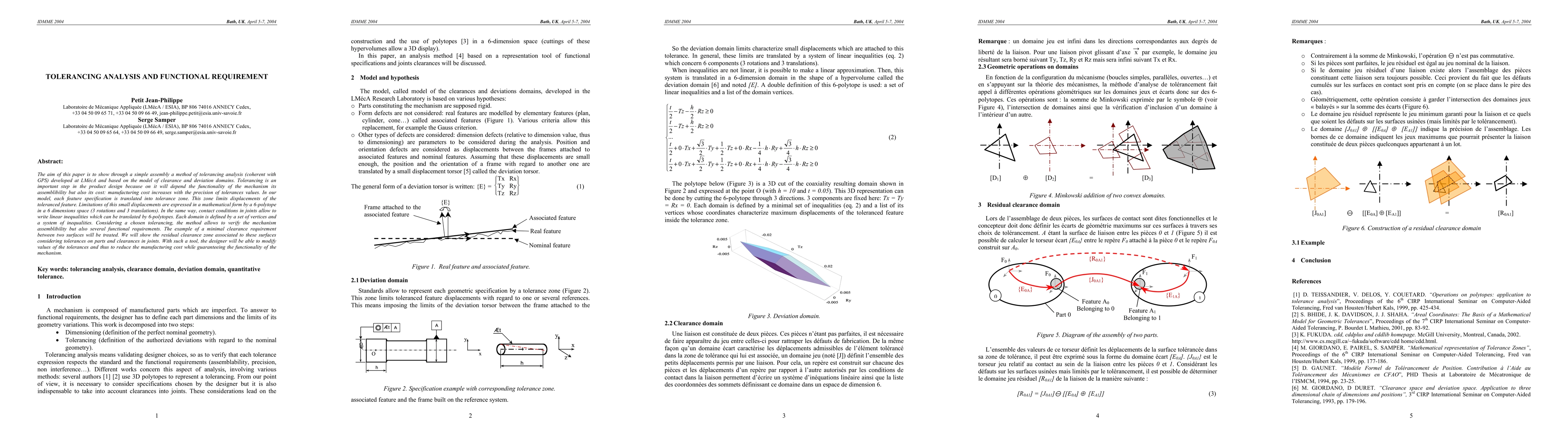 The aim of this paper is to show through a simple assembly a method of tolerancing analysis (coherent with GPS) developed at LM\'ecA and based on the model of clearance and deviation domains. Tolerancing is an important step in the product design because on it will depend the functionality of the mechanism its assemblibility but also its cost: manufacturing cost increases with the precision of tolerances values. In our model, each feature specification is translated into tolerance zone. This zone limits displacements of the toleranced feature. Limitations of this small displacements are expressed in a mathematical form by a 6-polytope in a 6 dimensions space (3 rotations and 3 translations). In the same way, contact conditions in joints allow to write linear inequalities which can be translated by 6-polytopes. Each domain is defined by a set of vertices and a system of inequalities. Considering a chosen tolerancing, the method allows to verify the mechanism assemblibility but also several functional requirements. The example of a minimal clearance requirement between two surfaces will be treated. We will show the residual clearance zone associated to these surfaces considering tolerances on parts and clearances in joints. With such a tool, the designer will be able to modify values of the tolerances and thus to reduce the manufacturing cost while guaranteeing the functionality of the mechanism.