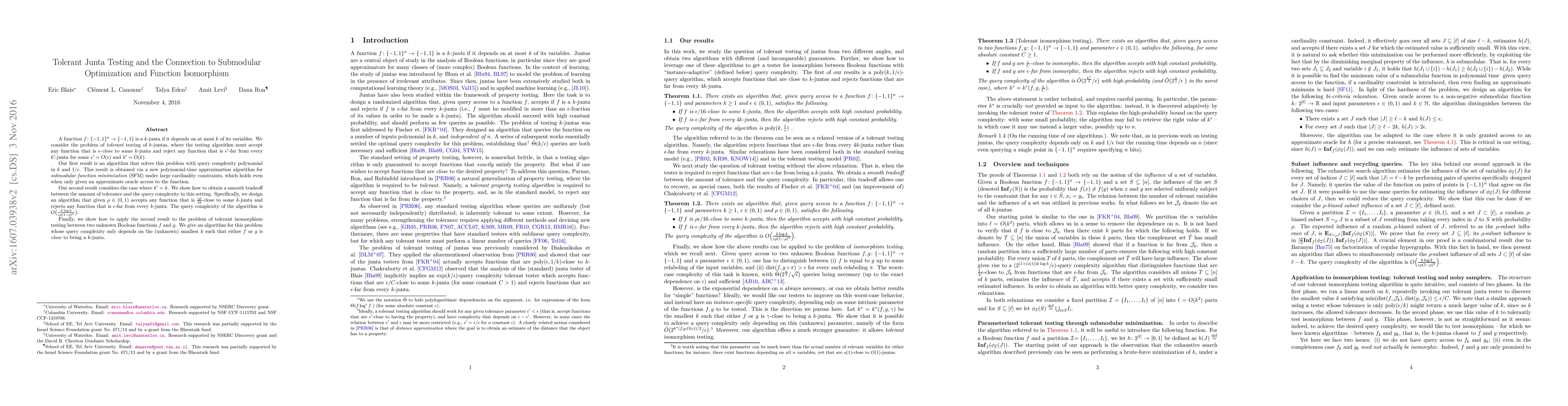 This paper presents algorithms for tolerant testing of $k$-juntas and their connection to submodular optimization and function isomorphism. It introduces an efficient algorithm for testing $k$-juntas with polynomial query complexity and leverages submodular function minimization to achieve this. It also explores a trade-off between tolerance and query complexity for the same problem and applies these techniques to tolerant isomorphism testing between Boolean functions.