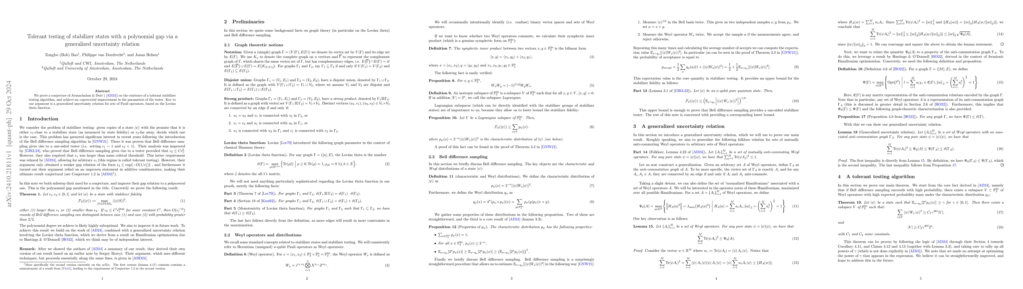 This paper proves a conjecture about a tolerant stabilizer testing algorithm, achieving exponential improvement in its parameters, by utilizing a generalized uncertainty relation for Pauli operators grounded in the Lovasz theta function.