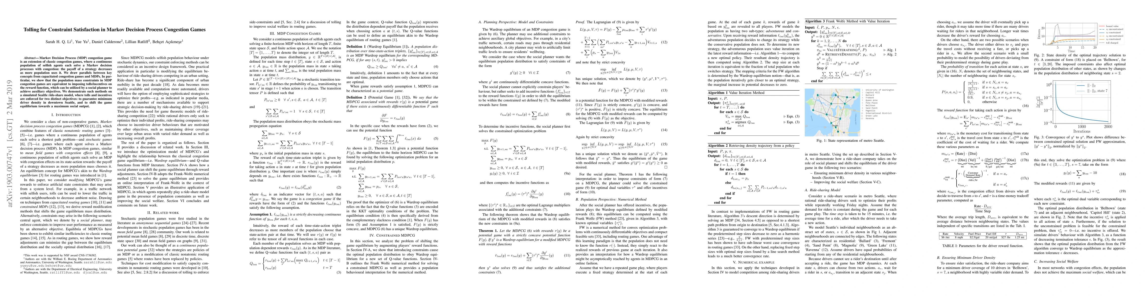 This paper explores Markov decision process (MDP) congestion games, demonstrating that population mass constraints can be managed by tolling strategies, akin to imposing incentives on the reward function. The authors apply these methods in a simulated Seattle ride-share model to achieve minimum driver density and maximize social output.