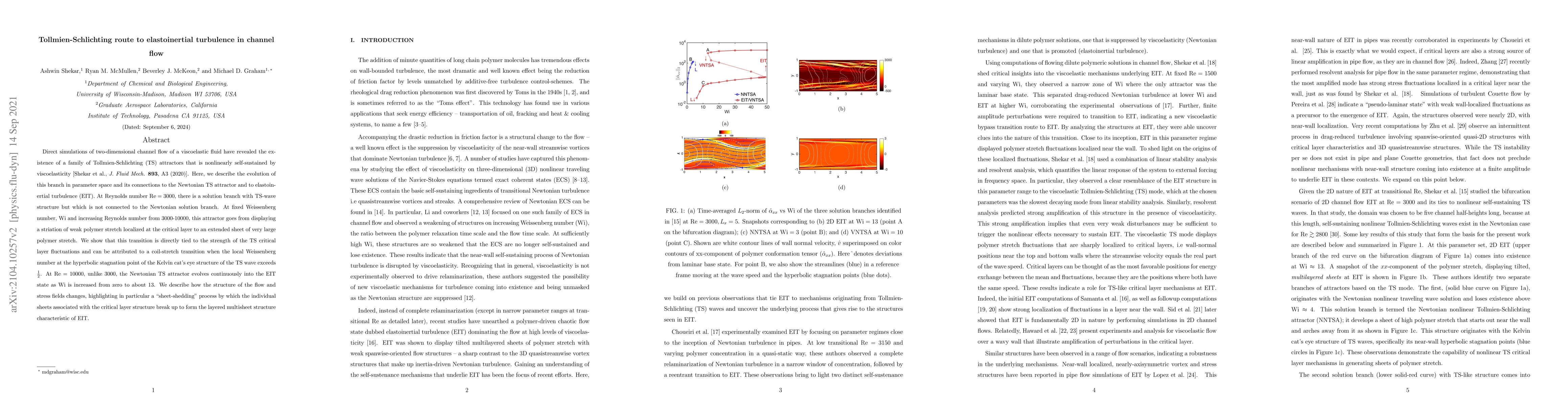 Direct simulations of two-dimensional channel flow of a viscoelastic fluid have revealed the existence of a family of Tollmien-Schlichting (TS) attractors that is nonlinearly self-sustained by viscoelasticity [Shekar et al., J.Fluid Mech. 893, A3 (2020)]. Here, we describe the evolution of this branch in parameter space and its connections to the Newtonian TS attractor and to elastoinertial turbulence (EIT). At Reynolds number $Re=3000$, there is a solution branch with TS-wave structure but which is not connected to the Newtonian solution branch. At fixed Weissenberg number, $Wi$ and increasing Reynolds number from 3000-10000, this attractor goes from displaying a striation of weak polymer stretch localized at the critical layer to an extended sheet of very large polymer stretch. We show that this transition is directly tied to the strength of the TS critical layer fluctuations and can be attributed to a coil-stretch transition when the local Weissenberg number at the hyperbolic stagnation point of the Kelvin cat's eye structure of the TS wave exceeds $\frac{1}{2}$. At $Re=10000$, unlike $3000$, the Newtonian TS attractor evolves continuously into the EIT state as $Wi$ is increased from zero to about $13$. We describe how the structure of the flow and stress fields changes, highlighting in particular a "sheet-shedding" process by which the individual sheets associated with the critical layer structure break up to form the layered multisheet structure characteristic of EIT.