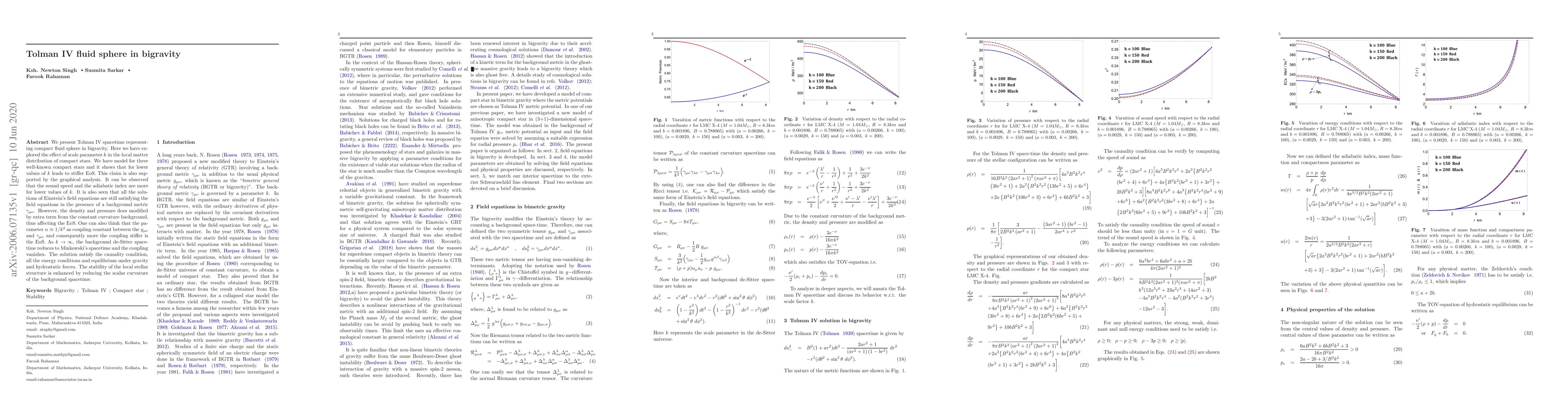 We present Tolman IV spacetime representing compact fluid sphere in bigravity. Here we have explored the effect of scale parameter $k$ in the local matter distribution of compact stars. We have model for three well-known compact stars and it shows that for lower values of $k$ leads to stiffer EoS. This claim is also supported by the graphical analysis. It can be observed that the sound speed and the adiabatic index are more for lower values of $k$. It is also seen that all the solutions of Einstein's field equations are still satisfying the field equations in the presence of a background metric $\gamma_{\mu \nu}$. However, the density and pressure does modified by extra term from the constant curvature background, thus affecting the EoS. One can also think that the parameter $\alpha \equiv 1/k^2$ as coupling constant between the $g_{\mu \nu}$ and $\gamma_{\mu \nu}$ and consequently more the coupling stiffer is the EoS. As $k\rightarrow \infty$, the background de-Sitter spacetime reduces to Minkowski's spacetime and the coupling vanishes. The solution satisfy the causality condition, all the energy conditions and equilibrium under gravity and hydrostatic forces. The stability of the local stellar structure is enhanced by reducing the scalar curvature of the background spacetime.