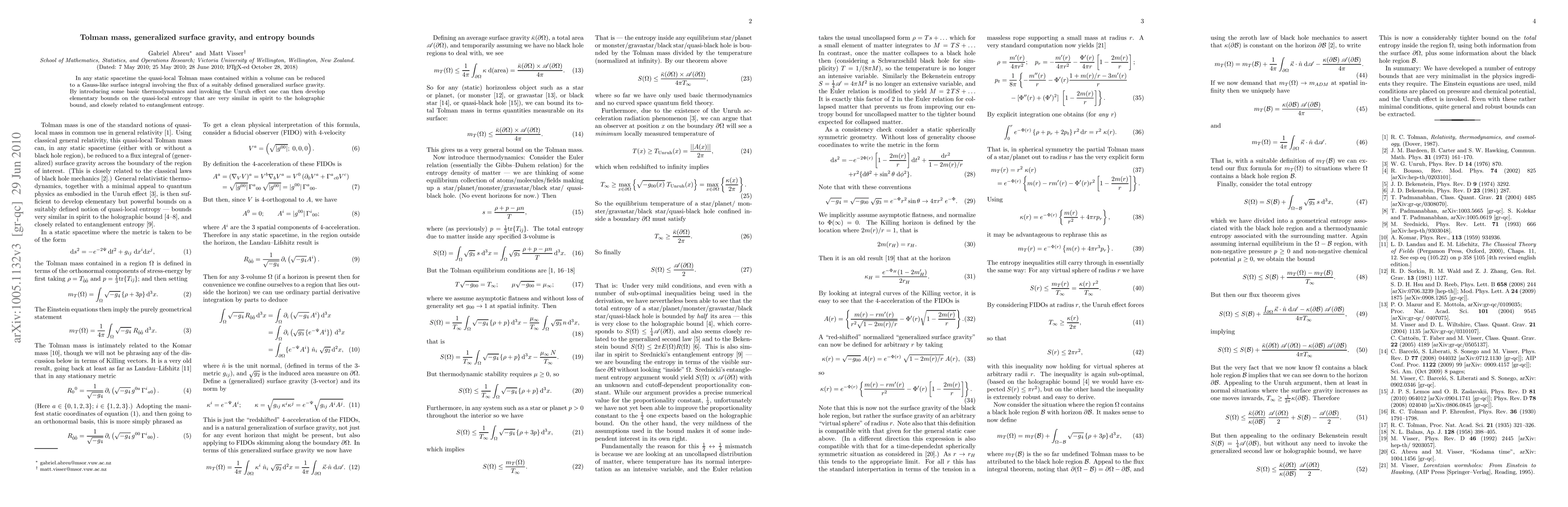 This paper establishes a Gauss-like surface integral for the Tolman mass in static spacetimes, linking it to generalized surface gravity. It further develops entropy bounds resembling holographic bounds, drawing connections to thermodynamics and the Unruh effect.