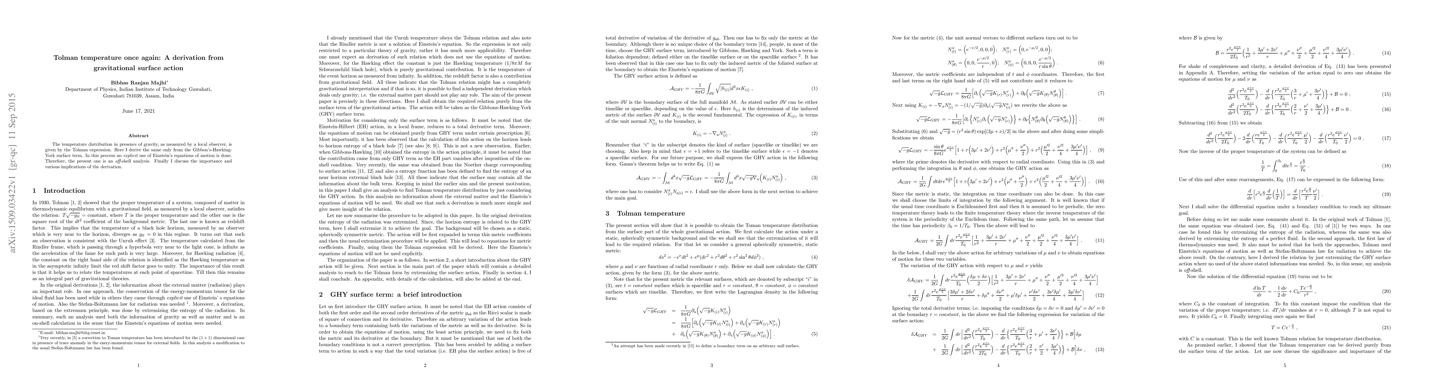 This paper derives the Tolman temperature distribution in gravitational fields solely from the Gibbon's-Hawking-York surface term, without using Einstein's equations, highlighting its significance and various implications.