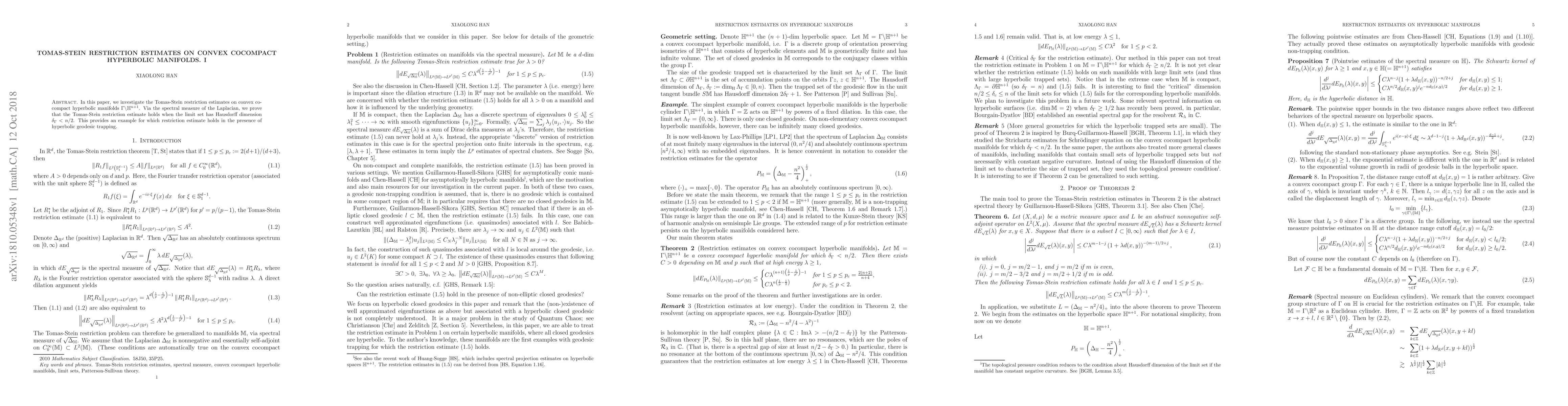 Summary: This paper establishes Tomas-Stein restriction estimates on convex cocompact hyperbolic manifolds, proving the estimates hold when the limit set's Hausdorff dimension is less than half the manifold's dimension, providing insight into such estimates under hyperbolic geodesic trapping.