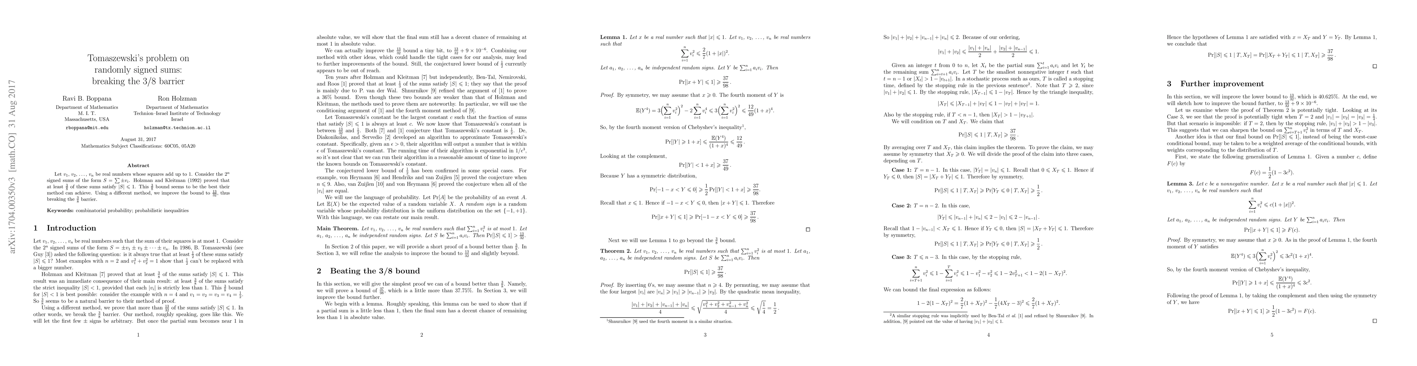 This paper enhances upon Holzman and Kleitman's 1992 work on Tomaszewski's Problem, which concerns sums of real numbers with squared sums equal to 1. The improvement utilizes a distinct method to raise the minimum proportion of sums with absolute value ≤1 from 3/8 to 13/32, surpassing the previously established 3/8 threshold.