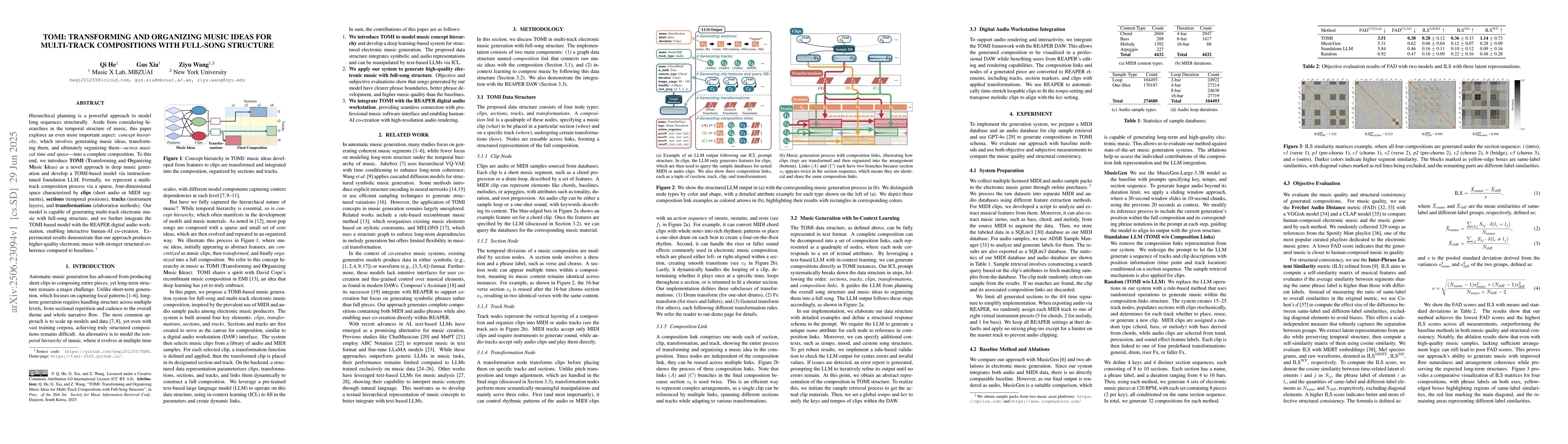 Hierarchical planning is a powerful approach to model long sequences structurally. Aside from considering hierarchies in the temporal structure of music, this paper explores an even more important aspect: concept hierarchy, which involves generating music ideas, transforming them, and ultimately organizing them--across musical time and space--into a complete composition. To this end, we introduce TOMI (Transforming and Organizing Music Ideas) as a novel approach in deep music generation and develop a TOMI-based model via instruction-tuned foundation LLM. Formally, we represent a multi-track composition process via a sparse, four-dimensional space characterized by clips (short audio or MIDI segments), sections (temporal positions), tracks (instrument layers), and transformations (elaboration methods). Our model is capable of generating multi-track electronic music with full-song structure, and we further integrate the TOMI-based model with the REAPER digital audio workstation, enabling interactive human-AI co-creation. Experimental results demonstrate that our approach produces higher-quality electronic music with stronger structural coherence compared to baselines.