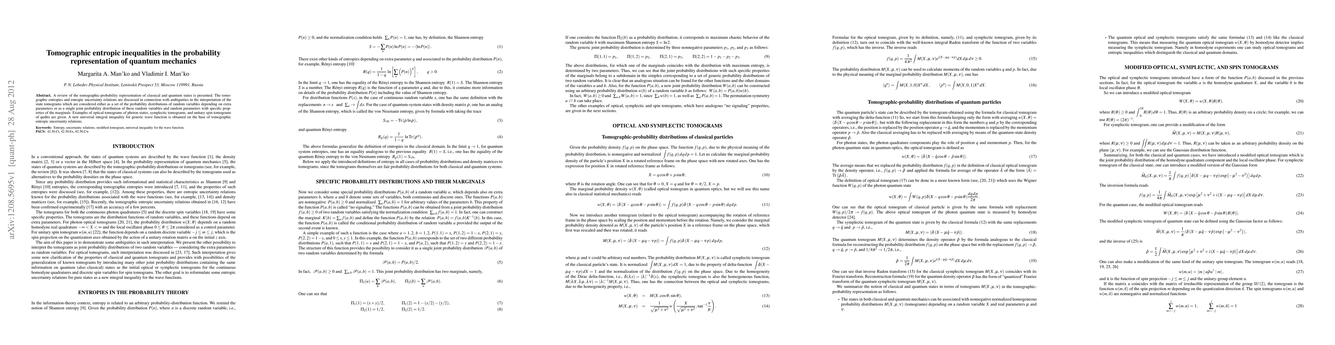 This paper reviews the tomographic-probability representation of quantum states, analyzing tomographic entropies and uncertainty relations. It discusses the interpretation of state tomograms and derives a new universal integral inequality based on tomographic entropic uncertainty relations, exemplified by optical and spin tomograms.