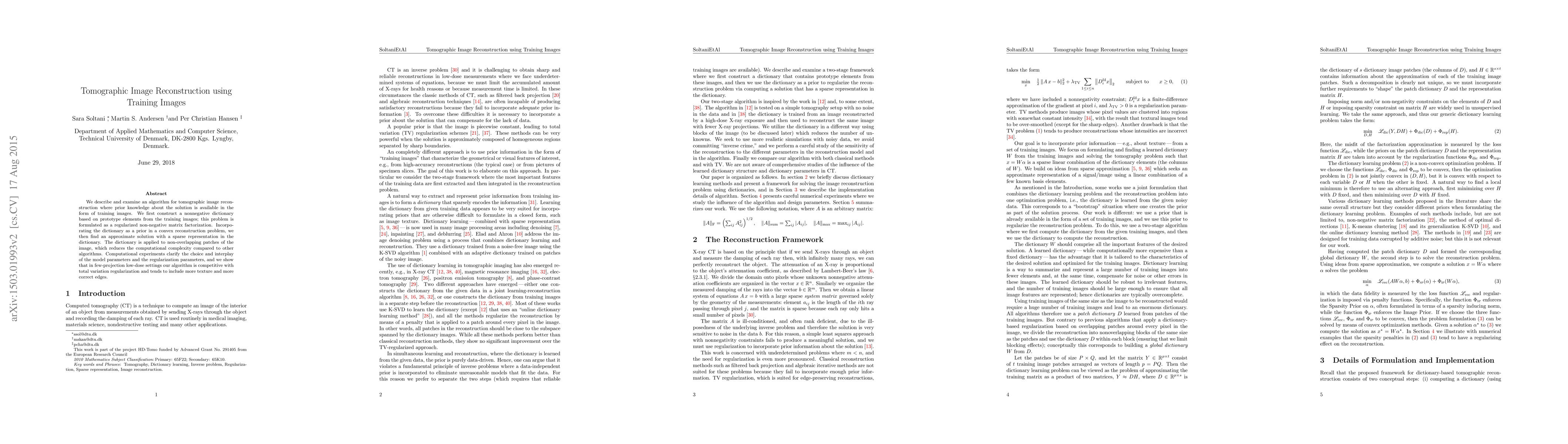 This paper proposes an algorithm for tomographic image reconstruction using training images to provide prior knowledge. It constructs a nonnegative dictionary from training images and applies it to image patches, achieving competitive results in low-dose settings with better texture and edge details compared to total variation regularization.