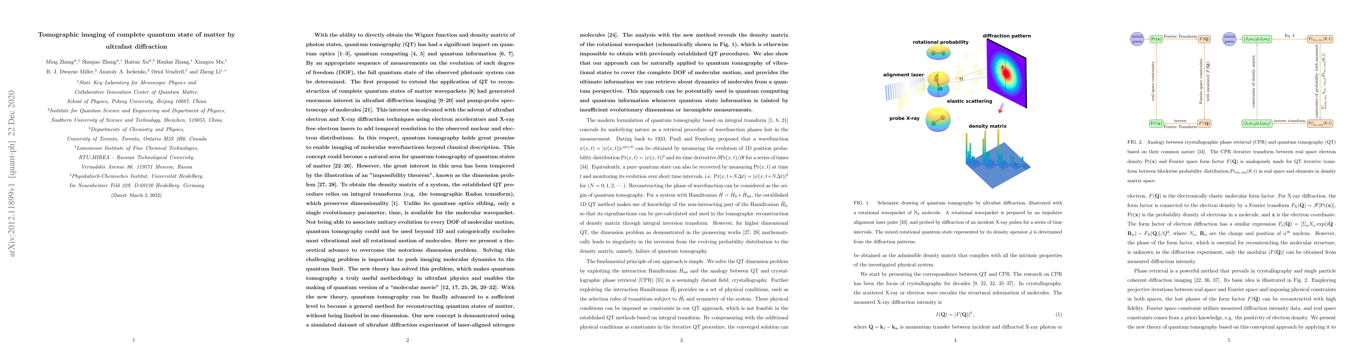 This paper proposes a theoretical advance to overcome the dimension problem in quantum tomography, enabling the reconstruction of complete quantum states of matter beyond 1D. The new methodology allows for the imaging of molecular dynamics at the quantum limit, demonstrated through a simulated ultrafast diffraction experiment of nitrogen molecules.