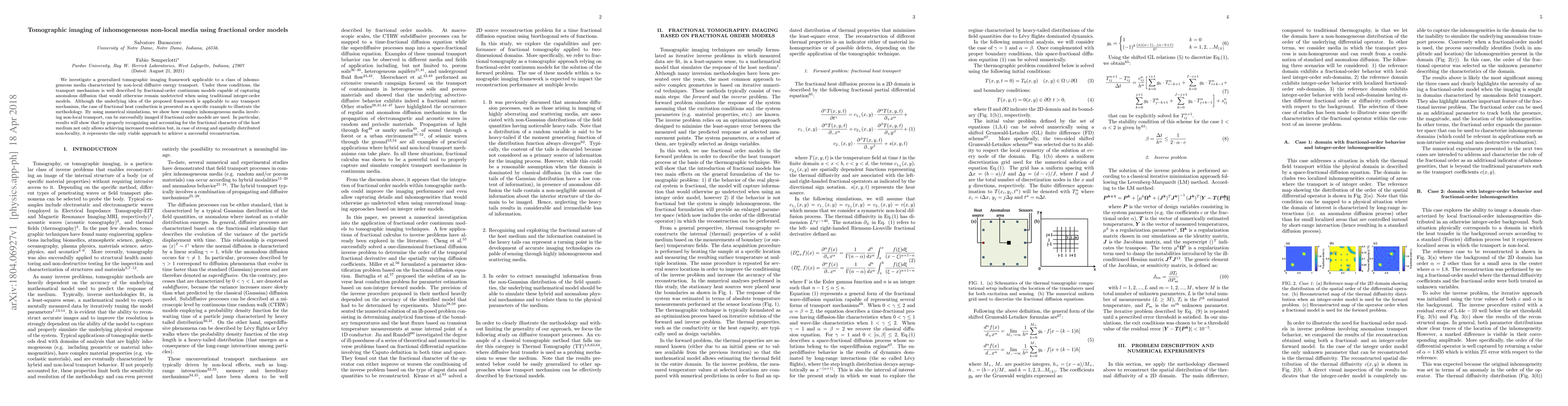 We investigate a generalized tomographic imaging framework applicable to a class of inhomogeneous media characterized by non-local diffusive energy transport. Under these conditions, the transport mechanism is well described by fractional-order continuum models capable of capturing anomalous diffusion that would otherwise remain undetected when using traditional integer-order models. Although the underlying idea of the proposed framework is applicable to any transport mechanism, the case of fractional heat conduction is presented as a specific example to illustrate the methodology. By using numerical simulations, we show how complex inhomogeneous media involving non-local transport, can be successfully imaged if fractional order models are used. In particular, results will show that by properly recognizing and accounting for the fractional character of the host medium not only allows achieving increased resolution but, in case of strong and spatially distributed non-locality, it represents the only viable approach to achieve a successful reconstruction.