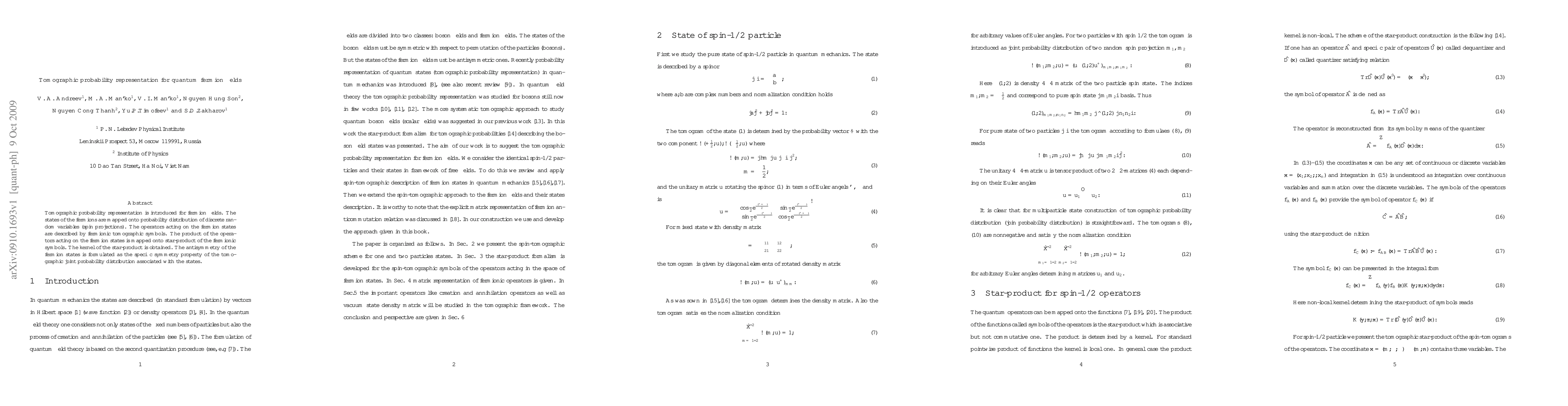 The paper introduces a tomographic probability representation for quantum fermion fields, mapping fermion states onto probability distributions of discrete random variables (spin projections) and describing operators via fermionic tomographic symbols, with the star-product capturing operator products and the kernel of this product derived. The antisymmetry of fermion states is expressed through specific symmetries in the joint probability distribution.