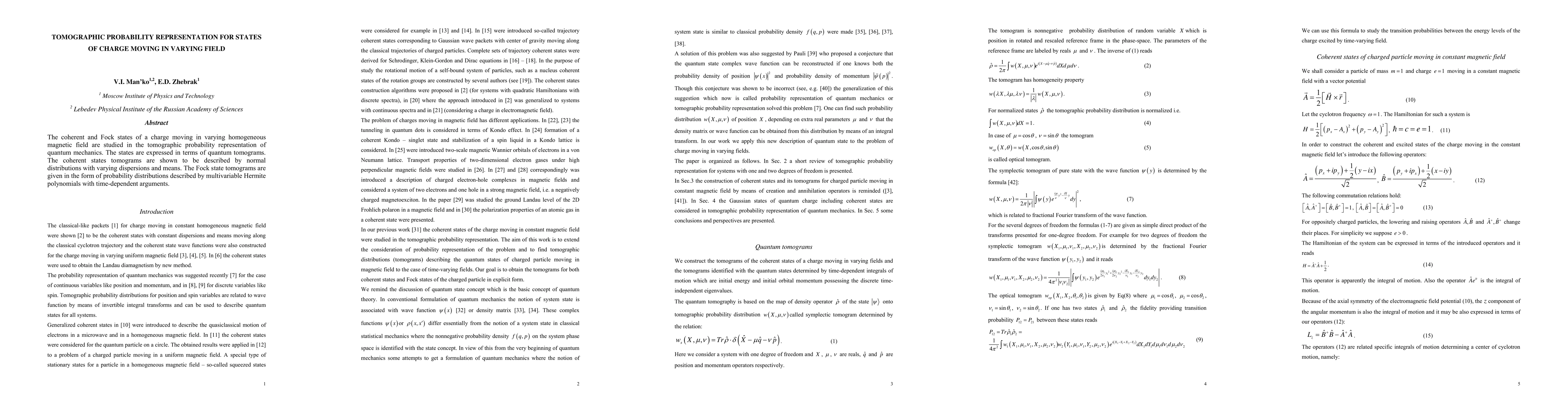 This paper investigates coherent and Fock states of a charge in a varying magnetic field using quantum mechanics' tomographic probability representation. Coherent states are represented by normal distributions with time-dependent means and dispersions, while Fock states are expressed via multivariable Hermite polynomials with time-dependent arguments.