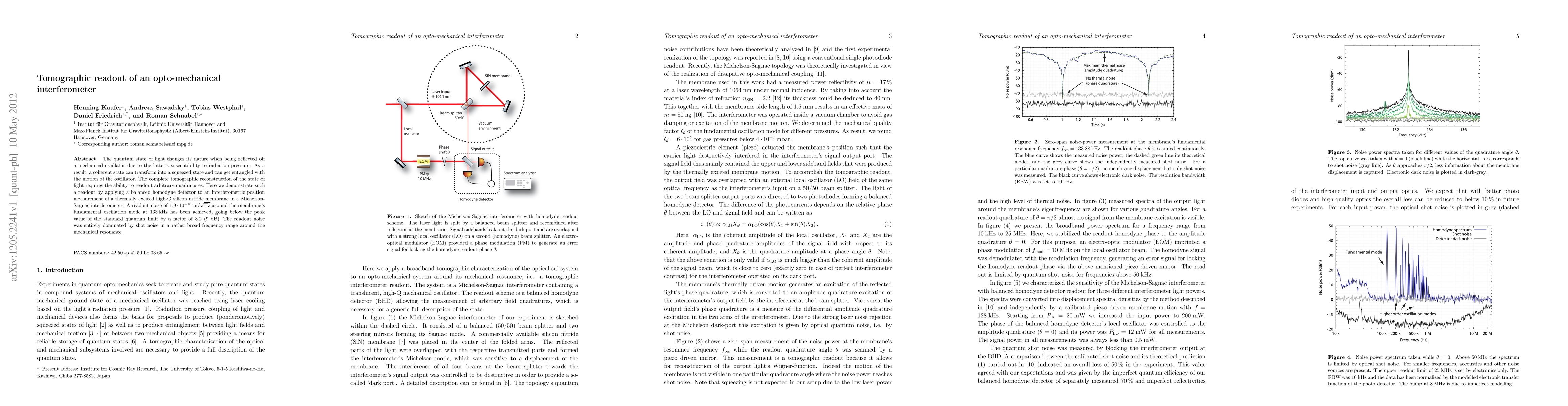 This paper demonstrates the tomographic readout of an opto-mechanical interferometer, achieving a readout noise below the standard quantum limit by a factor of 8.2, dominated by shot noise, and enabling the transformation and entanglement of light states with mechanical oscillators.