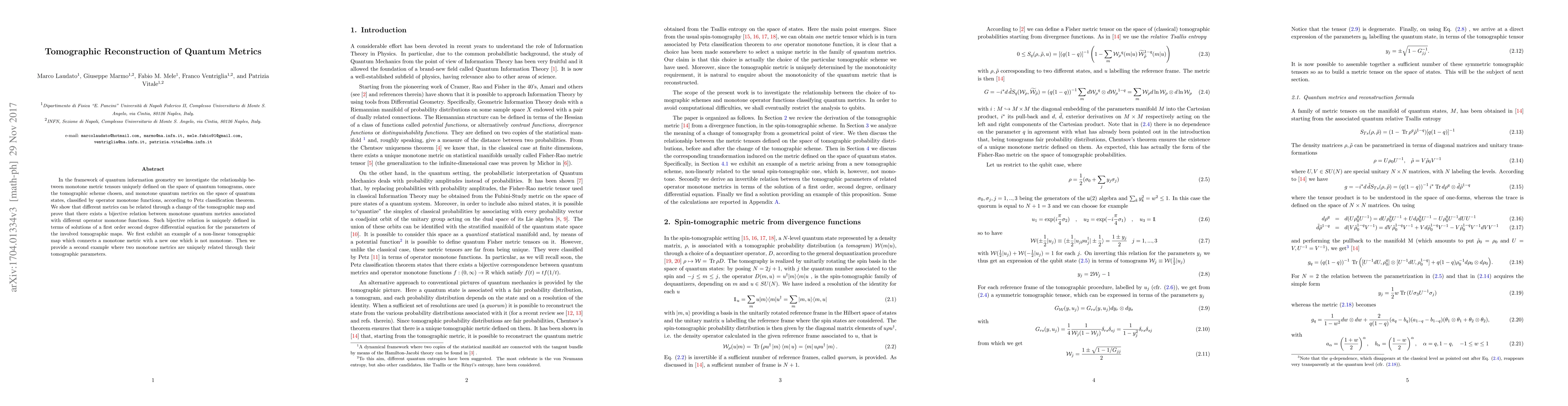 In the framework of quantum information geometry we investigate the relationship between monotone metric tensors uniquely defined on the space of quantum tomograms, once the tomographic scheme chosen, and monotone quantum metrics on the space of quantum states, classified by operator monotone functions, according to Petz classification theorem. We show that different metrics can be related through a change of the tomographic map and prove that there exists a bijective relation between monotone quantum metrics associated with different operator monotone functions. Such bijective relation is uniquely defined in terms of solutions of a first order second degree differential equation for the parameters of the involved tomographic maps. We first exhibit an example of a non-linear tomographic map which connects a monotone metric with a new one which is not monotone. Then we provide a second example where two monotone metrics are uniquely related through their tomographic parameters.