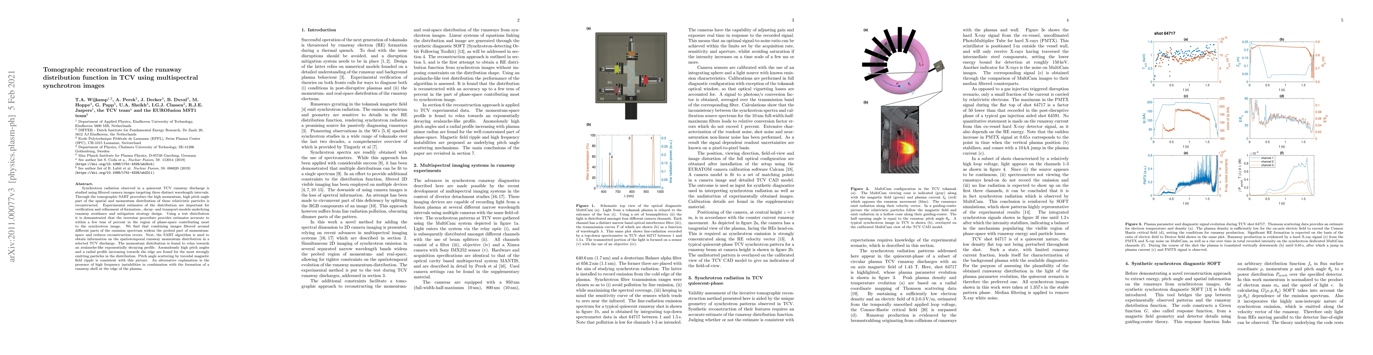 The research uses multispectral synchrotron images to reconstruct the runaway distribution function in TCV plasma, demonstrating accurate estimates within tens of percent. It finds that combining images from different wavelength intervals improves momentum-space probing and reduces errors. The study reveals an avalanche-like decay in the momentum distribution, along with anomalously high pitch angles and a radial profile increasing towards the edge. Possible explanations include magnetic field ripple scattering or high-frequency instabilities causing a runaway shell at the plasma edge.