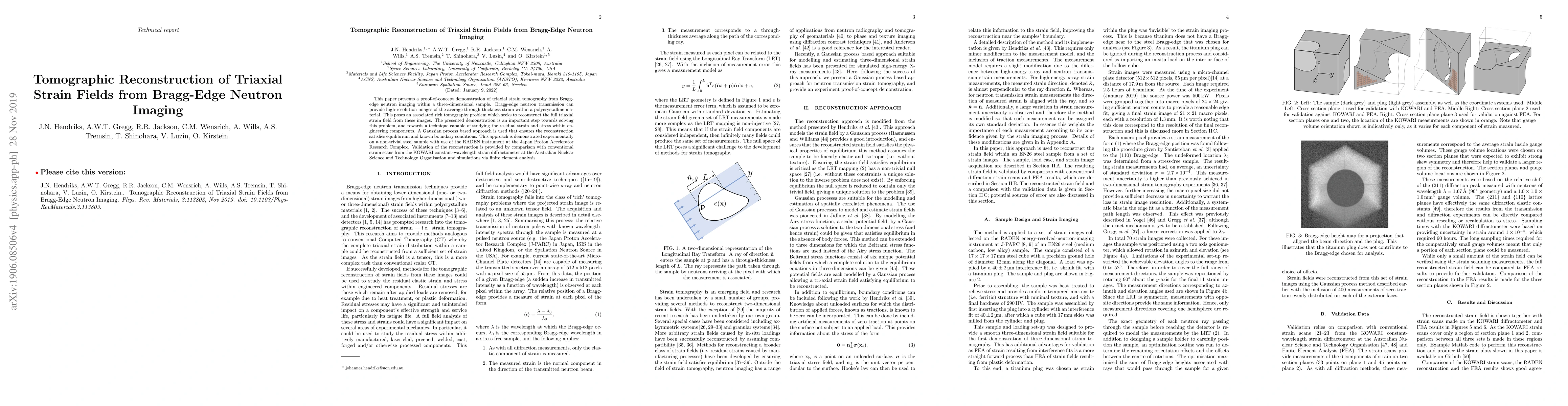 This paper demonstrates triaxial strain tomography using Bragg-edge neutron imaging, employing a Gaussian process to reconstruct the full strain field while satisfying equilibrium and boundary conditions. The method is validated experimentally on steel samples and compared with conventional strain scans and finite element simulations.