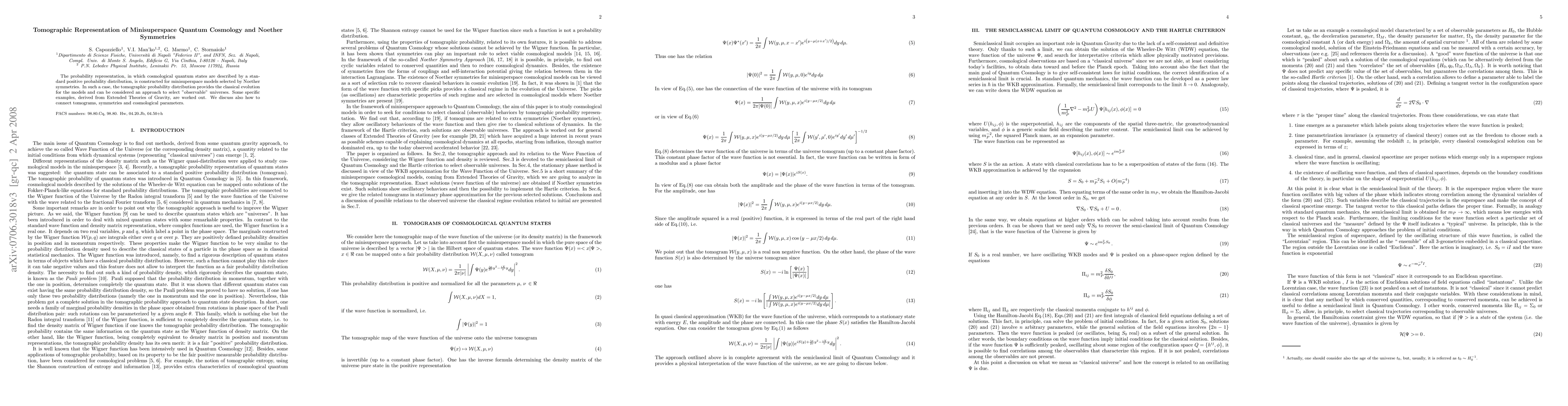 Researchers developed a method to construct probability representations for cosmological quantum states using Noether symmetries, which can select 'observable' universes. This approach provides a classical evolution for the models and connects tomograms, symmetries, and cosmological parameters.