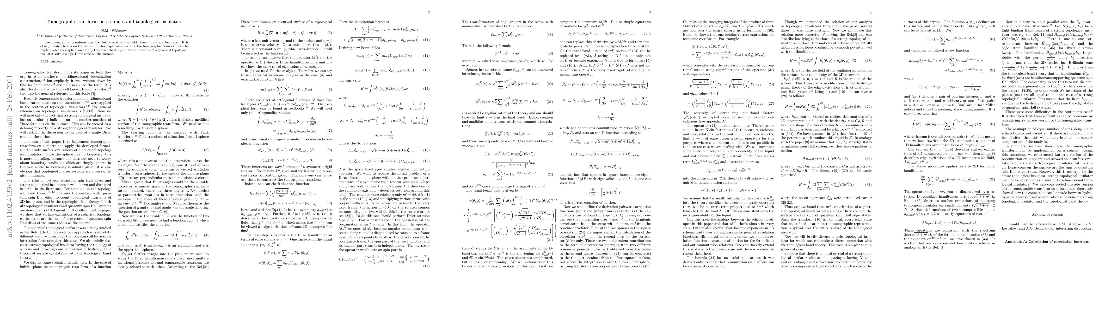 The tomographic transform was first introduced in the field theory literature long ago. It is closely related to Radon transform. In this paper we show how the tomographic transform can be implemented on a sphere and apply this result to study surface excitations of a spherical topological insulator with a single Dirac cone on the surface.