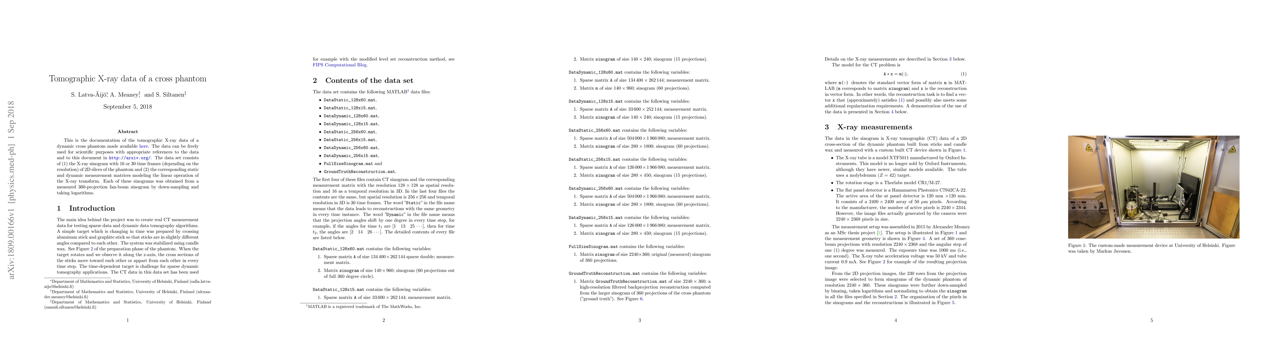 This is the documentation of the tomographic X-ray data of cross phantom made available at this https URL The data can be freely used for scientific purposes with appropriate references to the data and to this document in arxiv.org. The data set consists of (1) the X-ray sinogram with 16 or 30 time frames (depending on theresolution) of 2D slices of the phantom and (2) the corresponding static and dynamic measurement matrices modeling the linear operation of the X-ray transform. Each of these sinograms was obtained from a measured 360-projection fan-beam sinogram by down-sampling and taking logarithms. The original (measured) sinogram is also provided in its original form and resolution.