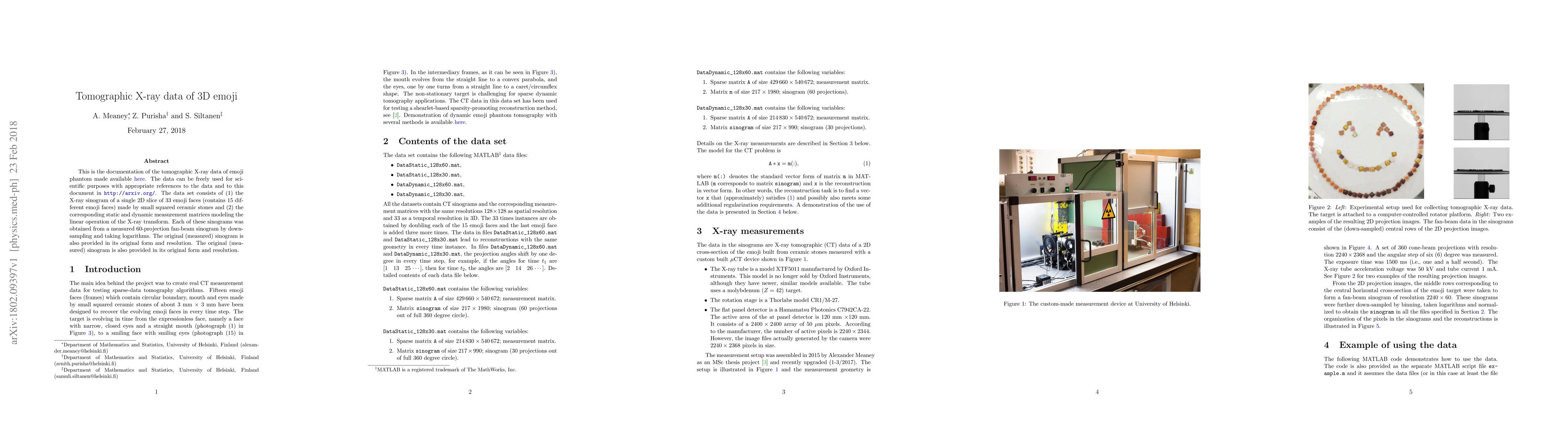 This is the documentation of the tomographic X-ray data of emoji phantom made available at https://zenodo.org/record/1183532#.WpA35Y5rIy1. The data can be freely used for scientific purposes with appropriate references to the data and to this document in arxiv.org. The data set consists of (1) the X-ray sinogram of a single 2D slice of 33 emoji faces (contains 15 different emoji faces) made by small squared ceramic stones and (2) the corresponding static and dynamic measurement matrices modeling the linear operation of the X-ray transform. Each of these sinograms was obtained from a measured 60-projection fan-beam sinogram by down-sampling and taking logarithms. The original (measured) sinogram is also provided in its original form and resolution. The original (measured) sinogram is also provided in its original form and resolution.