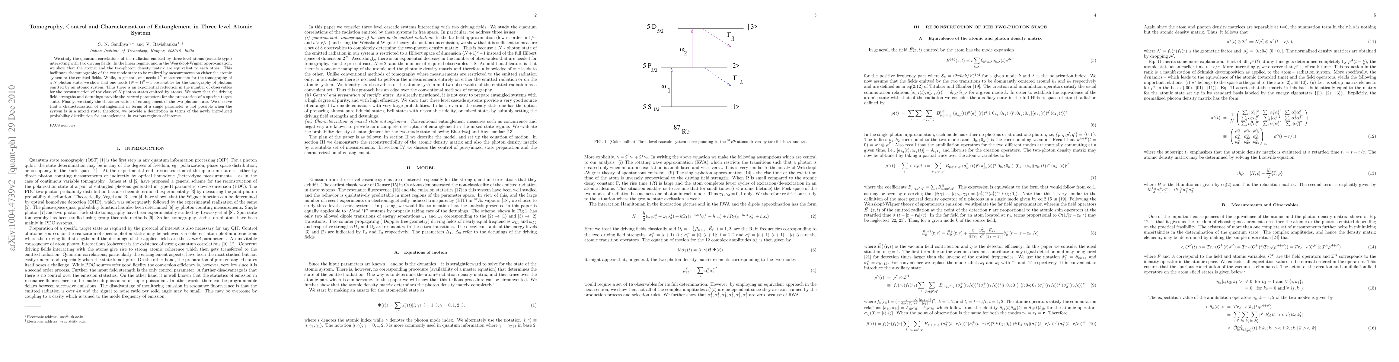 We study the quantum correlations of the radiation emitted by three level atoms (cascade type) interacting with two driving fields. In the linear regime, and in the Weisskopf-Wigner approximation, we show that the atomic and the two-photon density matrix are equivalent to each other. This facilitates the tomography of the two mode state to be realized by measurements on either the atomic system or the emitted fields. While, in general, one needs 4^N measurements for the tomography of a N photon state, we show that one needs (N+1)^2-1 observables for the tomography of photons emitted by an atomic system. Thus there is an exponential reduction in the number of observables for the reconstruction of the class of N photon states emitted by atoms. We show that the driving field strengths and detunings provide the {\it control} parameters for the preparation of a specific target state. Finally, we study the characterization of entanglement of the two photon state. We observe that a characterization of entanglement in terms of a single parameter is not possible when the system is in a mixed state; therefore, we provide a description in terms of the newly introduced probability distribution for entanglement, in various regimes of interest.