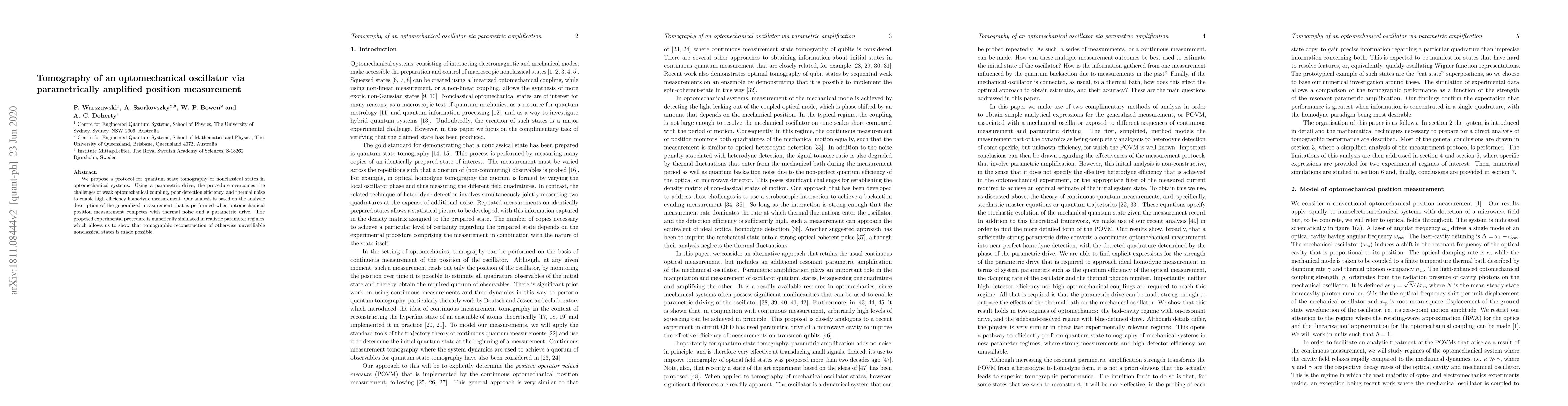 This paper proposes a protocol for quantum state tomography in optomechanical systems using parametrically amplified position measurement, overcoming challenges like weak coupling and thermal noise. Numerical simulations demonstrate the feasibility of reconstructing nonclassical states that were previously unobservable.