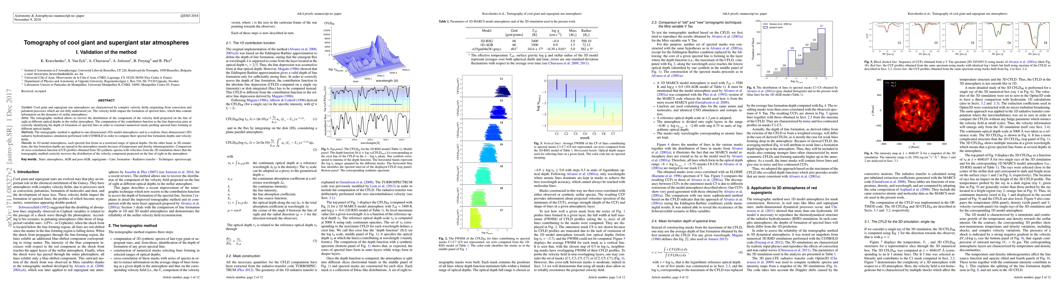 Cool giant and supergiant star atmospheres are characterized by complex velocity fields originating from convection and pulsation processes which are not fully understood yet. The velocity fields impact the formation of spectral lines, which thus contain information on the dynamics of stellar atmospheres. The tomographic method allows to recover the distribution of the component of the velocity field projected on the line of sight at different optical depths in the stellar atmosphere. The computation of the contribution function to the line depression aims at correctly identifying the depth of formation of spectral lines in order to construct numerical masks probing spectral lines forming at different optical depths. The tomographic method is applied to 1D model atmospheres and to a realistic 3D radiative hydrodynamics simulation performed with CO5BOLD in order to compare their spectral line formation depths and velocity fields. In 1D model atmospheres, each spectral line forms in a restricted range of optical depths. On the other hand, in 3D simulations, the line formation depths are spread in the atmosphere mainly because of temperature and density inhomogeneities. Comparison of CCF profiles obtained from 3D synthetic spectra with velocities from the 3D simulation shows that the tomographic method correctly recovers the distribution of the velocity component projected on the line of sight in the atmosphere.