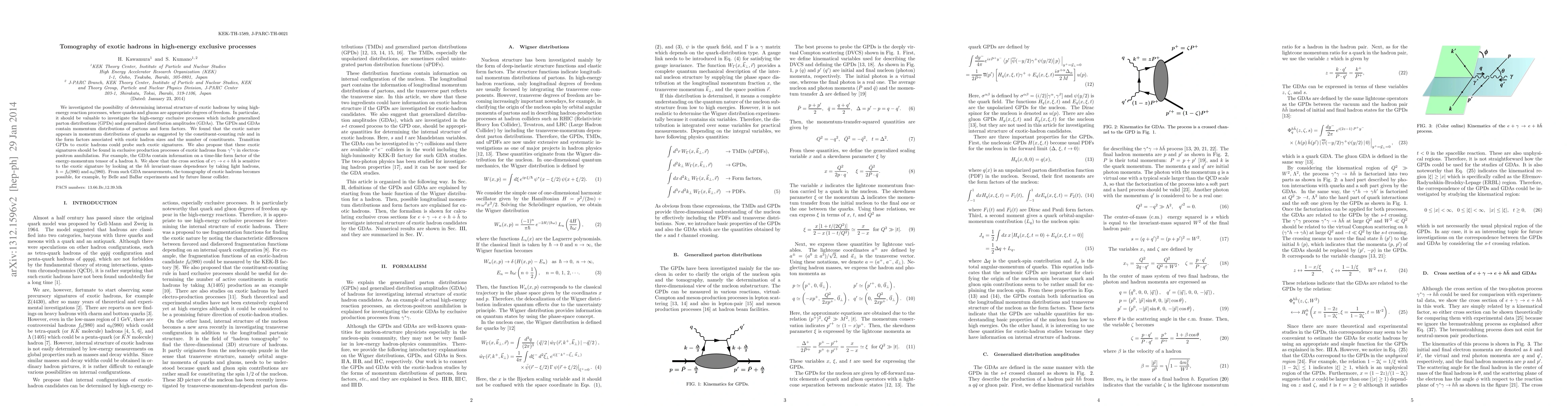 This paper explores the internal structure of exotic hadrons through high-energy exclusive processes using generalized parton distributions and distribution amplitudes. It finds that exotic signatures in momentum distributions and form factors can be probed in transitions to these hadrons, particularly in processes involving gamma^* gamma in electron-positron annihilation, suggesting potential for tomography via Belle and BaBar experiments and future linear colliders.