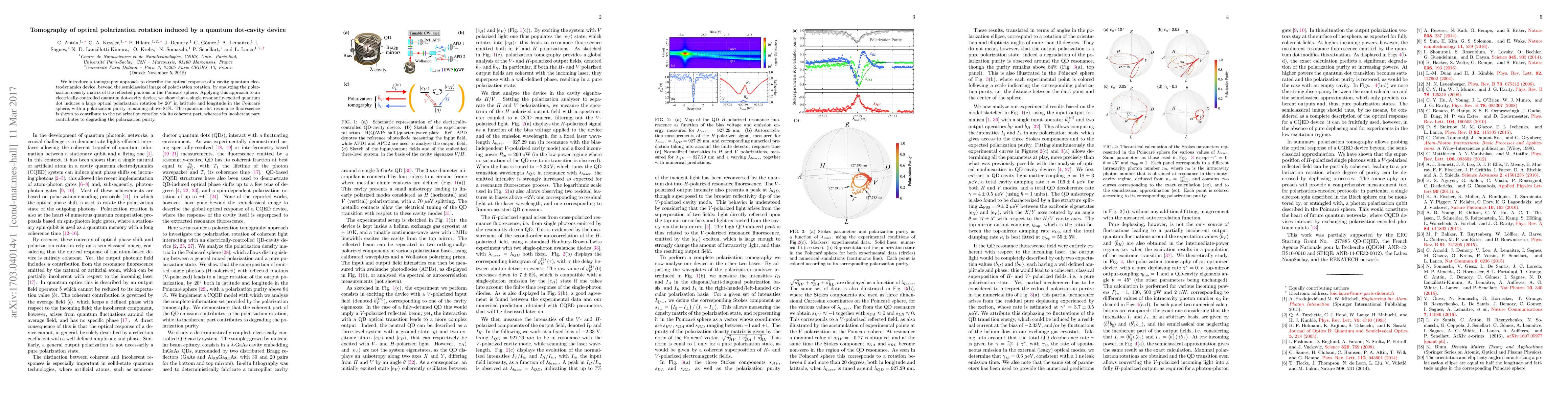 This paper proposes a tomography method to analyze the optical polarization rotation in a quantum dot-cavity device, revealing a $20^\circ$ polarization rotation in the Poincar\'e sphere due to a single quantum dot. The study finds that coherent quantum dot fluorescence enhances polarization rotation, while incoherent fluorescence reduces polarization purity.