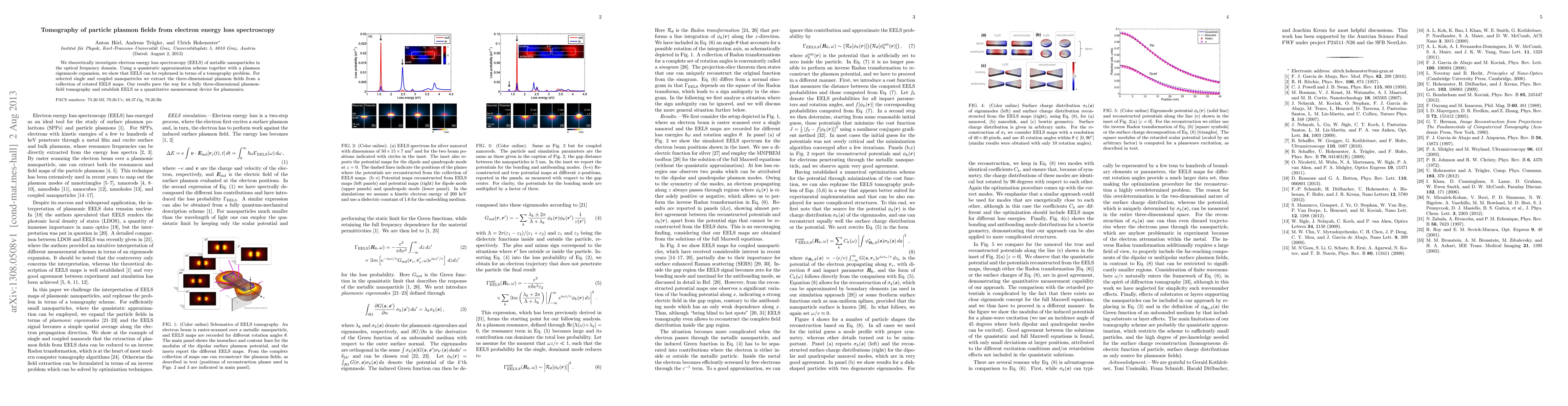 We theoretically investigate electron energy loss spectroscopy (EELS) of metallic nanoparticles in the optical frequency domain. Using a quasistatic approximation scheme together with a plasmon eigenmode expansion, we show that EELS can be rephrased in terms of a tomography problem. For selected single and coupled nanoparticles we extract the three-dimensional plasmon fields from a collection of rotated EELS maps. Our results pave the way for a fully three-dimensional plasmon-field tomography and establish EELS as a quantitative measurement device for plasmonics.