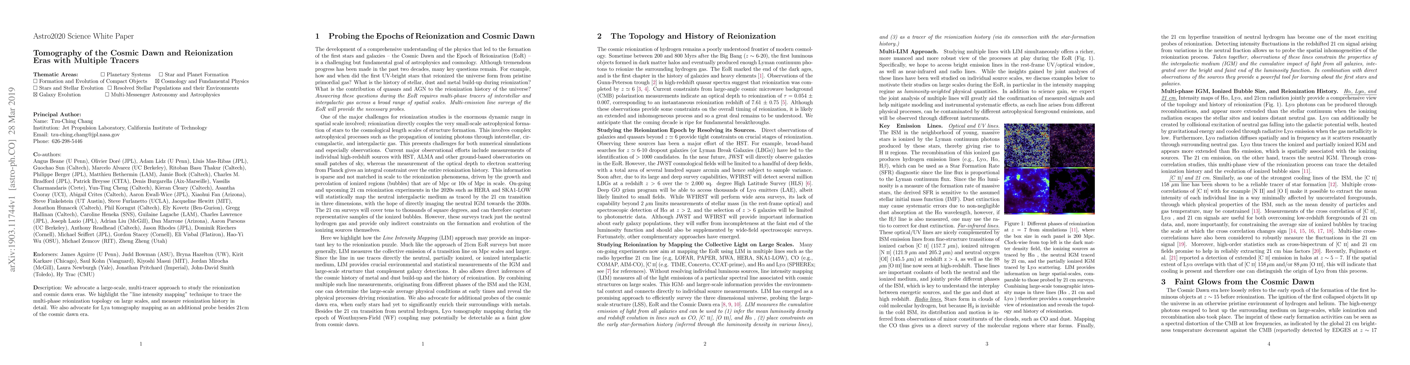 This paper explores the Cosmic Dawn and Reionization epochs using a multi-tracer approach, emphasizing line intensity mapping for 21cm and Lya tomography to trace reionization and cosmic dawn details. It advocates for comprehensive astrophysics and cosmology insights through these techniques.