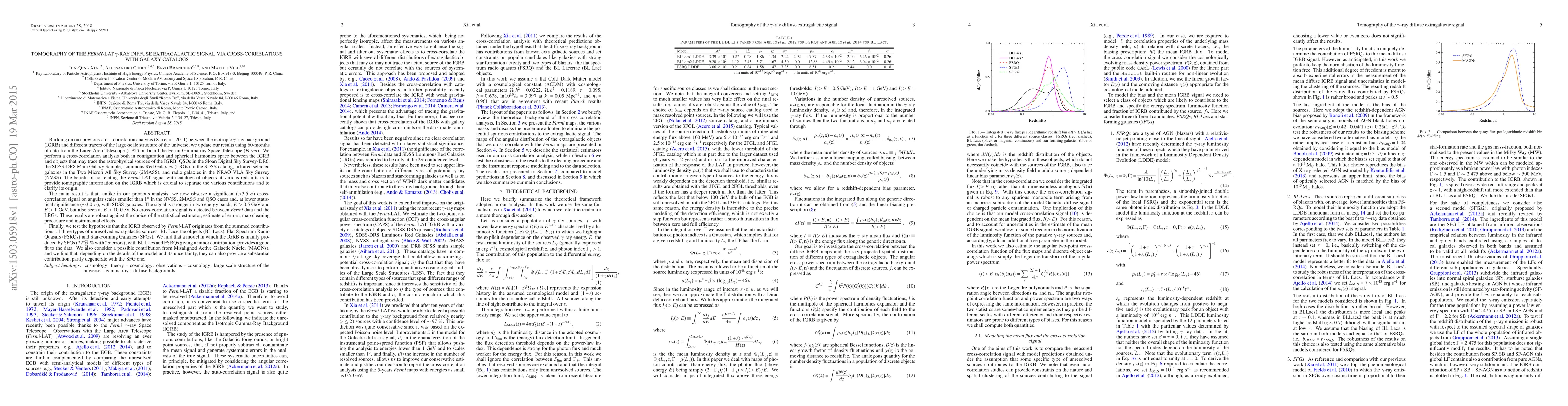 This paper updates a cross-correlation analysis between the isotropic gamma-ray background (IGRB) and various galaxy catalogs using 60 months of Fermi-LAT data. The study finds significant cross-correlation signals, providing tomographic information crucial for separating IGRB contributions and clarifying its origin, with a model suggesting that star-forming galaxies are the main source, while BL Lacs, FSRQs, and possibly misaligned AGNs contribute to a lesser extent.