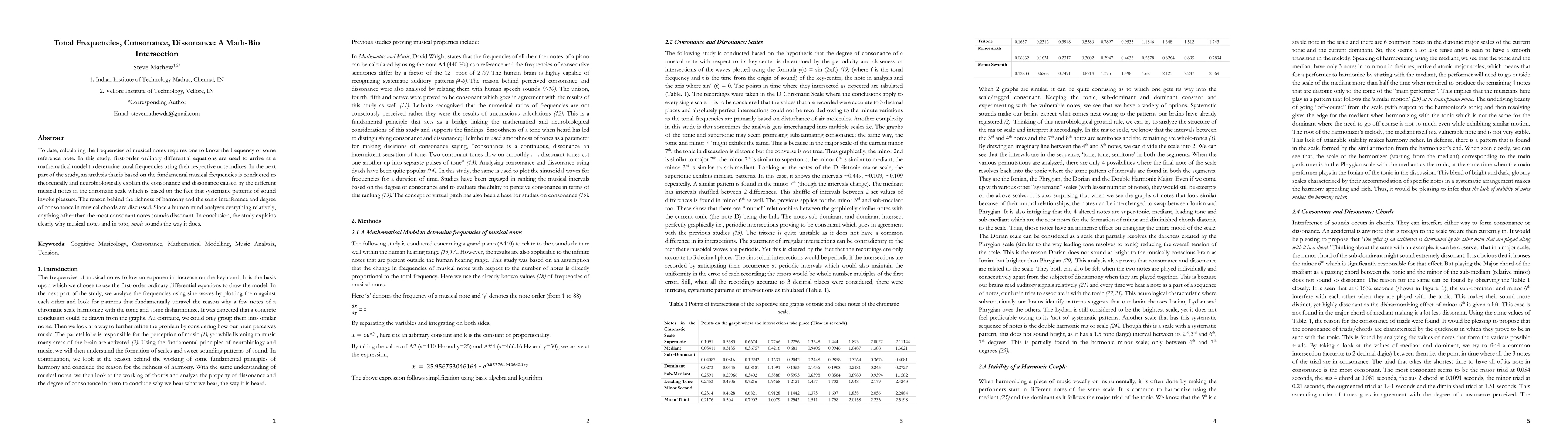 This study develops a mathematical model using first-order ordinary differential equations to determine tonal frequencies from note indices without a reference note. It further explores consonance and dissonance in music, linking fundamental frequencies to neurobiological responses and explaining the harmony and interference in musical chords.
