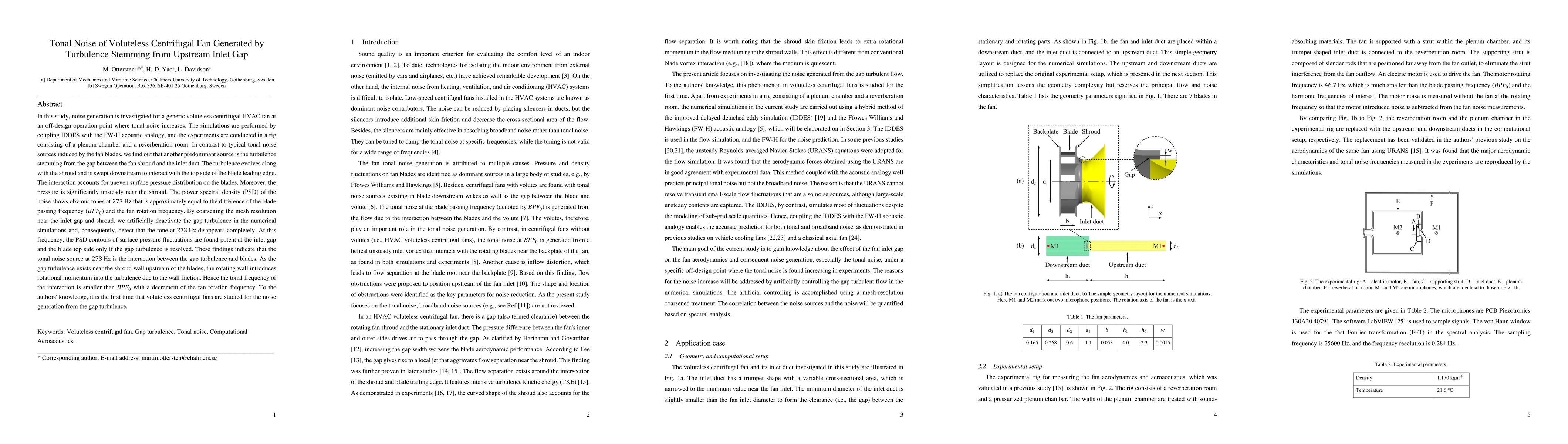 This study investigates tonal noise in a voluteless centrifugal HVAC fan, identifying turbulence from the inlet gap and shroud interaction as a predominant noise source. Numerical simulations using IDDES and FW-H reveal that the turbulence generates a tonal noise at 273Hz, linked to the interaction between the turbulence and the blade leading edge.