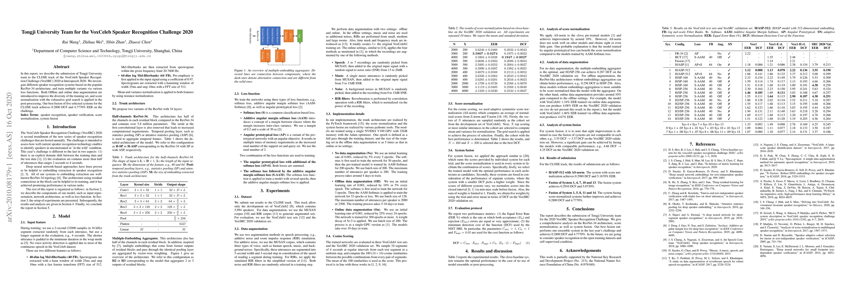 In this report, we describe the submission of Tongji University team to the CLOSE track of the VoxCeleb Speaker Recognition Challenge (VoxSRC) 2020 at Interspeech 2020. We investigate different speaker recognition systems based on the popular ResNet-34 architecture, and train multiple variants via various loss functions. Both Offline and online data augmentation are introduced to improve the diversity of the training set, and score normalization with the exhaustive grid search is applied in the post-processing. Our best fusion of five selected systems for the CLOSE track achieves 0.2800 DCF and 4.7770% EER on the challenge.
