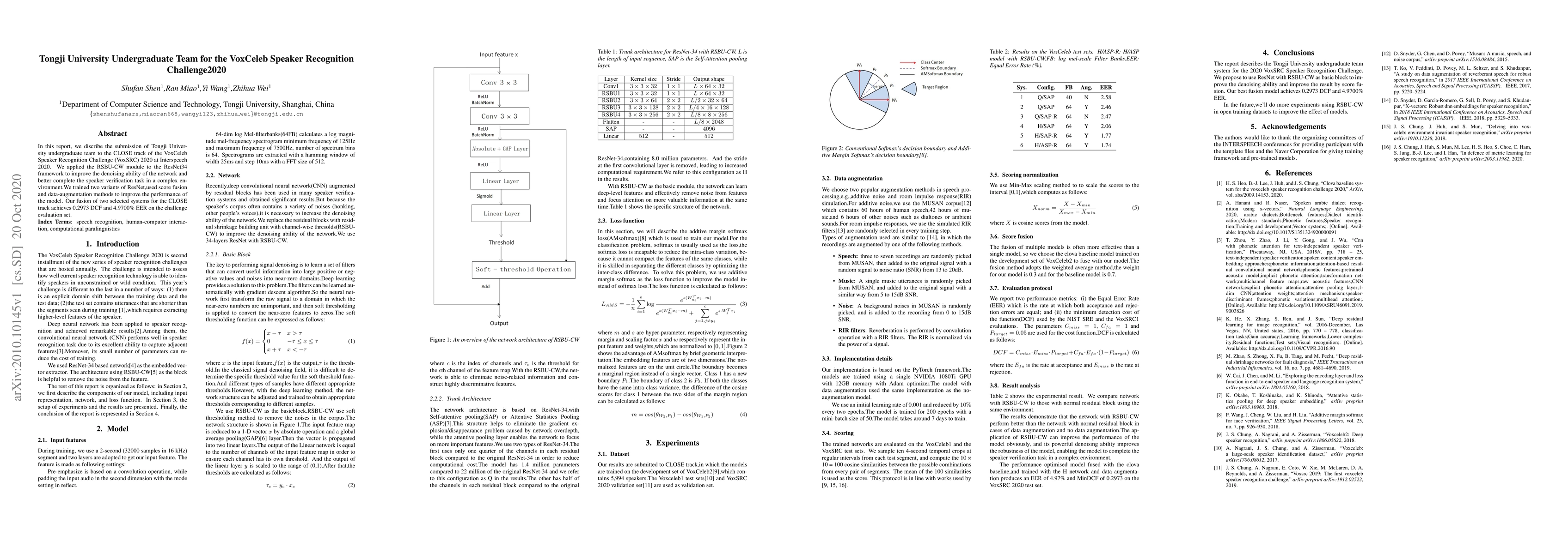 In this report, we discribe the submission of Tongji University undergraduate team to the CLOSE track of the VoxCeleb Speaker Recognition Challenge (VoxSRC) 2020 at Interspeech 2020. We applied the RSBU-CW module to the ResNet34 framework to improve the denoising ability of the network and better complete the speaker verification task in a complex environment.We trained two variants of ResNet,used score fusion and data-augmentation methods to improve the performance of the model. Our fusion of two selected systems for the CLOSE track achieves 0.2973 DCF and 4.9700\% EER on the challenge evaluation set.