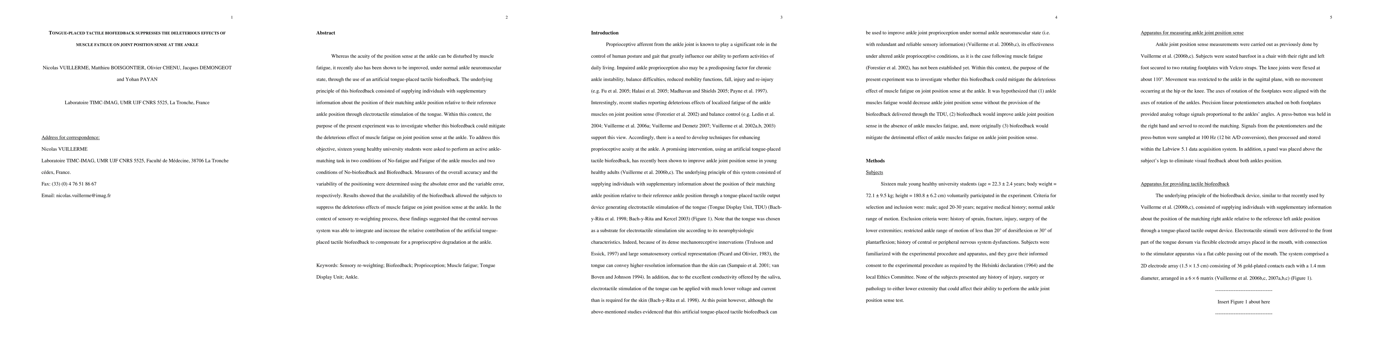 This study investigates whether tongue-placed tactile biofeedback can mitigate the adverse effects of muscle fatigue on ankle joint position sense. Results from the experiment involving young, healthy students showed that biofeedback improved accuracy and reduced variability in ankle matching tasks under fatigued conditions, suggesting the central nervous system effectively integrates this sensory input to compensate for proprioceptive degradation.