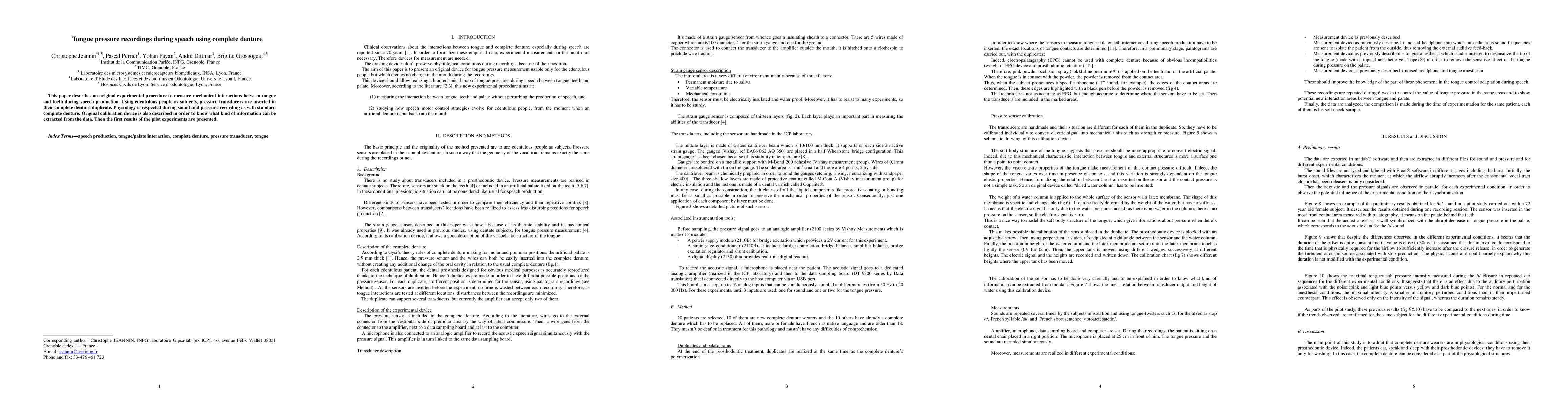 Researchers developed a method to measure tongue pressure during speech in edentulous individuals wearing complete dentures, aiming to understand mechanical interactions between the tongue and teeth.